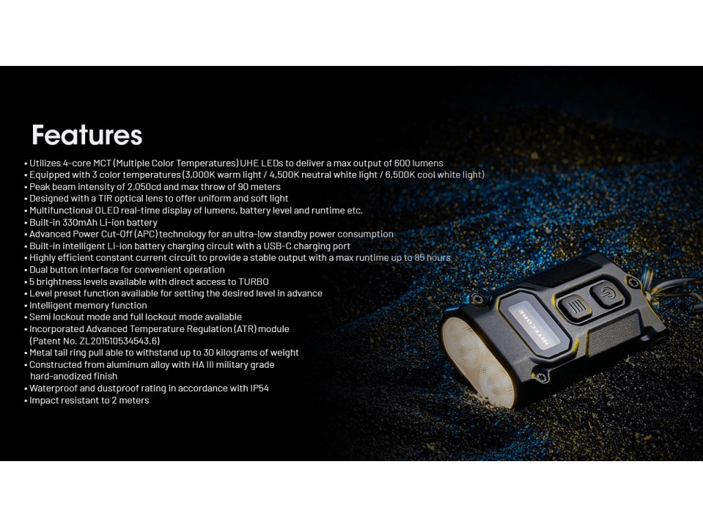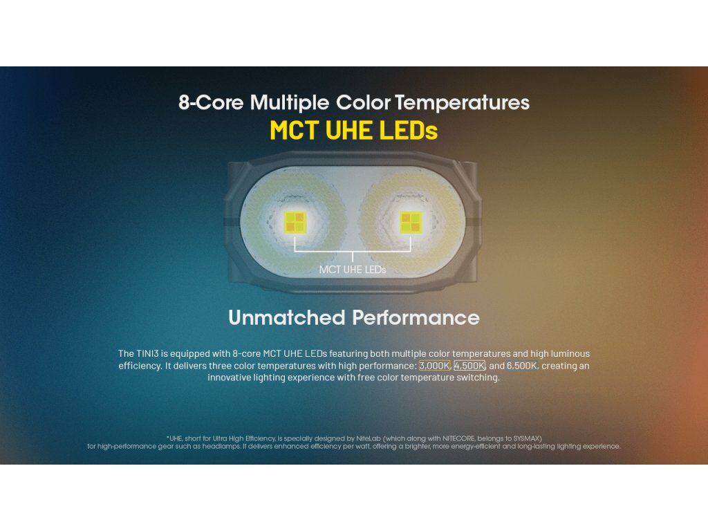 ⚡ Nitecore TINI3 MCT je revolučná inteligentná LED kľúčenka navrhnutá pre EDC nadšencov, profesionálov a všetkých, ktorí vyžadujú spoľahlivé kompaktné osvetlenie. S výkonom 600 lumens a dosahom 90 metrov predstavuje najnovší vrchol v technológii kľúčenkových svietidiel. Využíva inovatívnu 8-core MCT (Multiple Color Temperatures) UHE LED technológiu, ktorá umožňuje prepínanie medzi troma farebnými teplotami priamo v jednom zariadení.