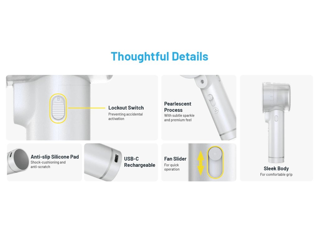 Jedinečný kruhový dizajn nádrže obopína hlavu ventilátora. Tým maximalizuje využitie priestoru, predlžuje čas zvlhčovania a zároveň vyzerá elegantne a moderne. Vyvážené rozloženie hmotnosti znižuje únavu ruky pri dlhšom držaní a doplnenie vody je rýchle – bez demontáže základnej jednotky.