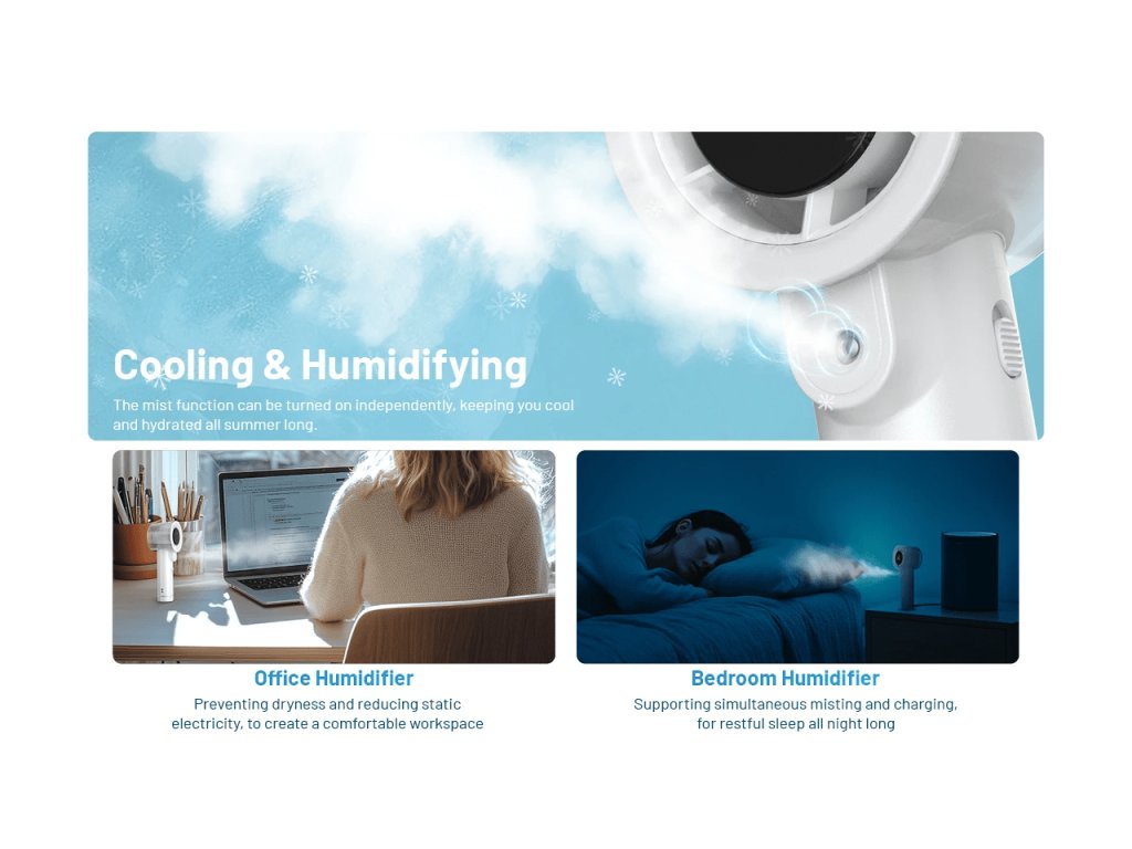 V kancelárii pracuje ako osobný zvlhčovač, doma ako tichý spoločník na spánok, vonku ako kompaktná „klíma do ruky“.