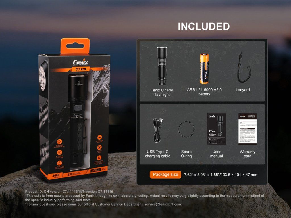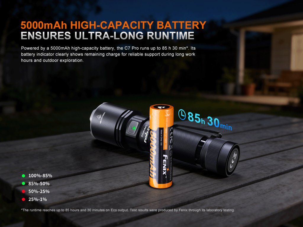 Fenix C7 PRO je nekompromisné nabíjateľné svietidlo stvorené pre tých, ktorí vyžadujú extrémny výkon a maximálnu spoľahlivosť. Ponúka ohromujúci svetelný tok až 4600 lúmenov (ANSI) s dosvitom do vzdialenosti neuveriteľných 339 metrov. Srdcom svietidla je špičkový Li-ion akumulátor typu 21700 s obrovskou kapacitou 5000 mAh (je súčasťou balenia), ktorý pohodlne a rýchlo nabijete priamo v svietidle cez moderný USB-C konektor.