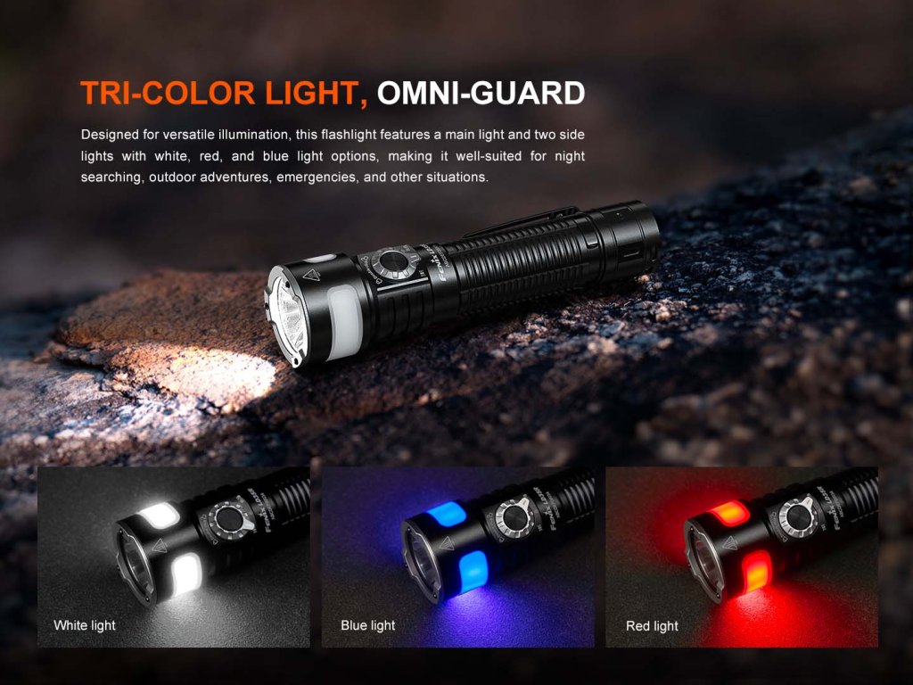 - Päť režimov bočného farebného svetla: 15 lúmenov SOS červeno (51,1 hodiny) -> 15 lúmenov blikanie na červeno a modro (31,4 hodiny) -> 15 lúmenov blikanie na modro (30,4 hodiny) -> 15 lúmenov blikanie na červeno (55,2 hodiny) -> 5 lúmenov stále svietenie na červeno (60,6 hodiny).