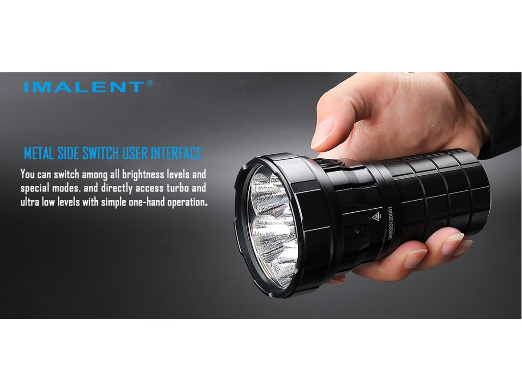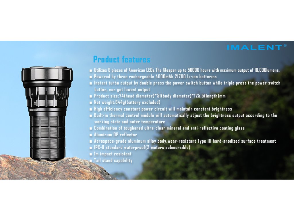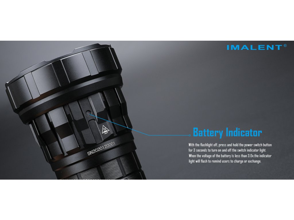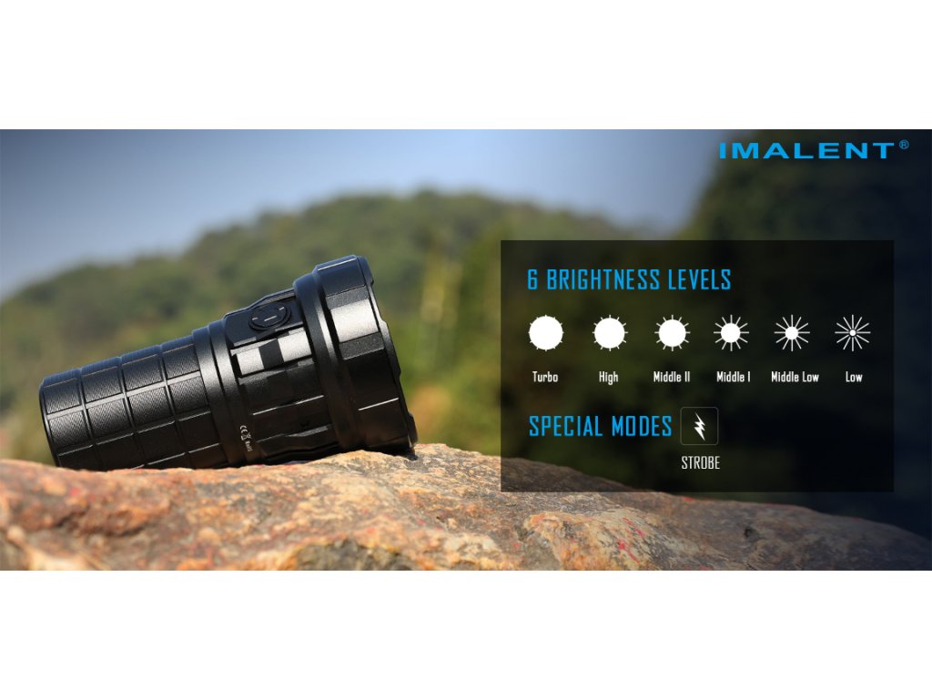 LED baterka IMALENT R60C sa radí medzi kompaktné a veľmi výkonné LED svietidlá, nakoľko pri svojej dĺžke iba 12,55cm, ponúka neuveriteľný výkon 18000lm s dosahom svetla 1038m. V hlave svietidla je osadená výkonná 6x Luminus SST70 LED. Farba svetla je studená biela. Ponúka 7 režimov svietenia: TURBO 100%-18%, 33%-18%, 18%, 11%, 7%, 2% + 1 zábleskový režim STROBE. Táto ručná LED baterka je ovládaná pomocou jedného kovového okrúhleho tlačidla, z bočnej strany tela svietidla. Tlačidlo je vyrobené z ocele. Zmena svetelného režimu, prebieha pomocou držania spínača na hlave svietidla. Na hlave svietidla sa nachádza aj 2x farebná LED indikácia stavu vybitia 3x Li-ion akumulátora 21700 3,6V, ktorá vás včas informuje, že máte ešte dostatok energie. Napájanie zabezpečuje nový typ 3x Li-ion akumulátora 21700 s kapacitou 4000mAh (je súčasťou balenia). Nabíjanie je riešené pomocou špeciálneho magnetického konektora, umiestneného na hlave svietidla (špeciálny nabíjací magnetický USB kábel je obsahom balenia). R60C sa pohodlne ovláda palcom jednej ruky a je jednoduché na používanie. Telo svietidla je vyrobené z kvalitnej leteckej hliníkovej zliatiny typu III s tvrdenou anodizovanou úpravou. Odoláva pádom z výšky 1m a je vodeodolné podľa štandardu IPX-8. Zadné veko batériovej časti tela svietidla je ploché, takže svietidlo môžete položiť zvisle a bude svietiť napr. ako ,,svieca". Sklo, ktoré chrání reflektor spolu so 6x Luminus LED je vyrobené z ultra číreho tvrdeného skla. Je odolné proti poškriabaniu a nárazu. Nabíjanie spomínaného 3x Li-ion akumulátora 21700 je riešené priamo v tele samotného svietidla nabíjacím prúdom 2A. Ide o pohodlné a rýchle nabíjanie. Všetky povrchy vodičov, sú pozlátené. Zlato je vynikajúci elektrický vodič a je extrémne odolné. Jeho odolnosť spočíva v schopnosti nepodliehať korózii vo vysokom stupni chemickej odolnosti. Odhaduje sa, že približne 70% porúch svietidiel, možno pripísať korozívnym poškodeniam, spôsobeným kyselinou alebo plynom z akumulátora/ batérií. Preto majú svetlá IMALENT, pozlátené kontakty. Vďaka tomuto skvelému opatreniu, vydržia svetlá IMALENT celé desaťročia. IMALENT R60C sa dá použiť na všetky druhy outdoorových aktivít, ako sú turistika, jaskyniarstvo, rybolov, poľovníctvo alebo aj pátranie a záchrana. Imalent R60C sa vďaka svojim kompaktným rozmerom a extrémnemu výkonu, môže stať vaším obľúbeným svietidlom. Parametre:Použitá LED: 6x Luminus SST70 LEDFarba svetla: Studená bielaŽivotnosť LED: 50000hod.Maximálny výstup LED: 18000lmDosah svetla: 1038mVhodné akumulátory: 3x Li-ion 21700 3,6-3,7V Svietidlo má výrazné ohnisko s postupným prechodom do haloPočet režimov: 7 Režimov: TURBO 100%-18%, 33%-18%, 18%, 11%, 7%, 2%, STROBEPamäť režimov: ÁnoPovrch reflektora: OP - Pomarančová kôraMateriál: Tvrdená letecká zliatina hliníka type III anti-abrazívny povrchFarba tela (povrchu) svietidla: ČiernaMaximálna výdrž svietenia: 90sek., pri dosiahnutí vnútornej teploty 65°C, tepelná ochrana automaticky prepne na nižší režim svietenia 3300lm-18% 116min. (max. výkon) Maximálna výdrž svietenia: 30hod. (min. výkon)Odolnosť voči nárazu: Z výšky 1mVodeodolnosť: Podľa štandardu IPX-8Doba svietenia: 100%-18% 18000-3300lm (90sek.+116min.), 33%-18% 6000lm-3300lm (110sek.+110min.), 18% 3300lm (2hod.05min.), 11% 2000lm (3hod.), 7% 1200lm (8hod.), 2% 300lm (30hod.)Rozmery: Dĺžka: 12,55cm, Priemer tela: 5,1cm, Priemer hlavy: 7,4cmVáha: 644g (bez akumulátora/ batérie) Obsah balenia:Svietidlo, 3x Li-ion akumulátor IMALENT 21700 4000mAh 3,6V, špeciálny nabíjací magnetický USB kábel, nylonové púzdro, 2x náhradné tesniace O-krúžky, manuál. Ovládanie svietidla:Odstránte plastový vymedzovací krúžok, ktorý sa môže nachádza vo vnútri tela svietidla pri akumulátoroch (plusový pól), po odskrutkovaní hlavy svietidla. Svietidlo sa zapína bočným kovovým spínačom na hlave svietidla tela. Zmena výkonu od 2% do 33%, prebieha pomocou stlačenia a držania stlačeného spínača. Režimy sa začnú cyklicky meniť: 2%, 7%, 11%, 18%, 33%-18%. TURBO 100% režim výkonu - Vo vypnutom/ zapnutom stave, 2x rýchlo po sebe stlačte spínač. Je ľahko ovládateľné jednou rukou. Pre dosiahnutie zábleskového režimu STROBE - Iba v Turbo 100% stave, 2x rýchlo po sebe stlačte spénač. Opätovným stlačením spínača svietidlo vypnete.Tepelná ochrana: Pri dosiahnutí vnútornej teploty 65°C, tepelná ochrana automaticky prepne z TURBO 100% 18000lm a potom aj pri 33% 6000lm výkonu na nižší režim svietenia 3300lm-18% 110min., aby sa zabránilo prehriatiu. Dĺžka svietenia v týchto režimoch svietenia je závislá od vonkajšej teploty prostredia. Ostatné režimy svietenia, majú tepelnú ochranu nastavenú na 55°C.Uzamknutie spínača - Vo vypnutom stave, 4x rýchlo po sebe stlačte spínač. Bočná 2xfarebná LED indikácia 3x blikne na zeleno, čo značí uzamknutie. Deaktivácia prebieha rovnakým spôsobom. 2x Farebná LED indikácia na hlave svietidla: Pri poklese napätia akumulátora (vybíjaním) sa mení aj farba 2x LED indikácie na hlave svietidla. Zelená značí dostatok napätia a to viac ako 3V. Červené svietenie a potom aj blikanie značí, čoskoré vybitie akumulátora a napätie akumulátora menej ako 3V. Ak je zostávajúce napätie akumulátora približne 2,8V, svietidlo sa vypne. Nabíjanie:V tele svietidla sa nachádzajú 3x Li-ion akumulátory 21700 4000mAh 3,6V. Nabíjanie je riešené pomocou špeciálneho magnetického konektora, umiestneného na hlave svietidla (špeciálny nabíjací magnetický USB kábel je obsahom balenia). Pripojte nabíjací magnetický kábel k bočnému magnetickému konektoru, ktorý je umiestnený na hlave svietidla a druhý koniec s USB konektorom, zapojte napr. do USB 