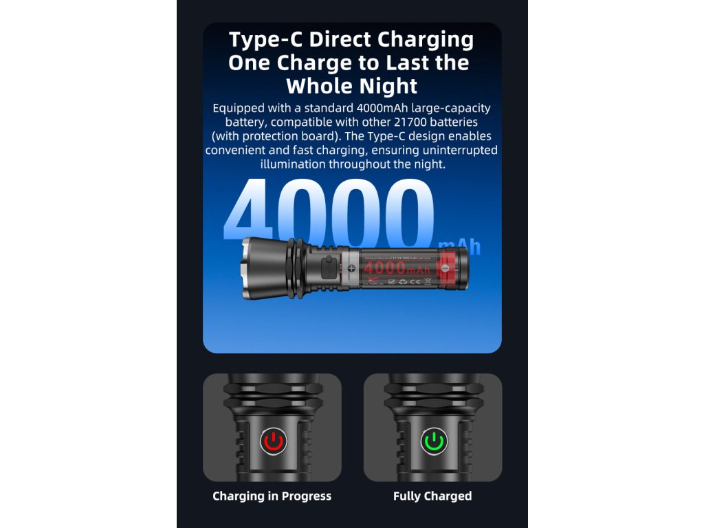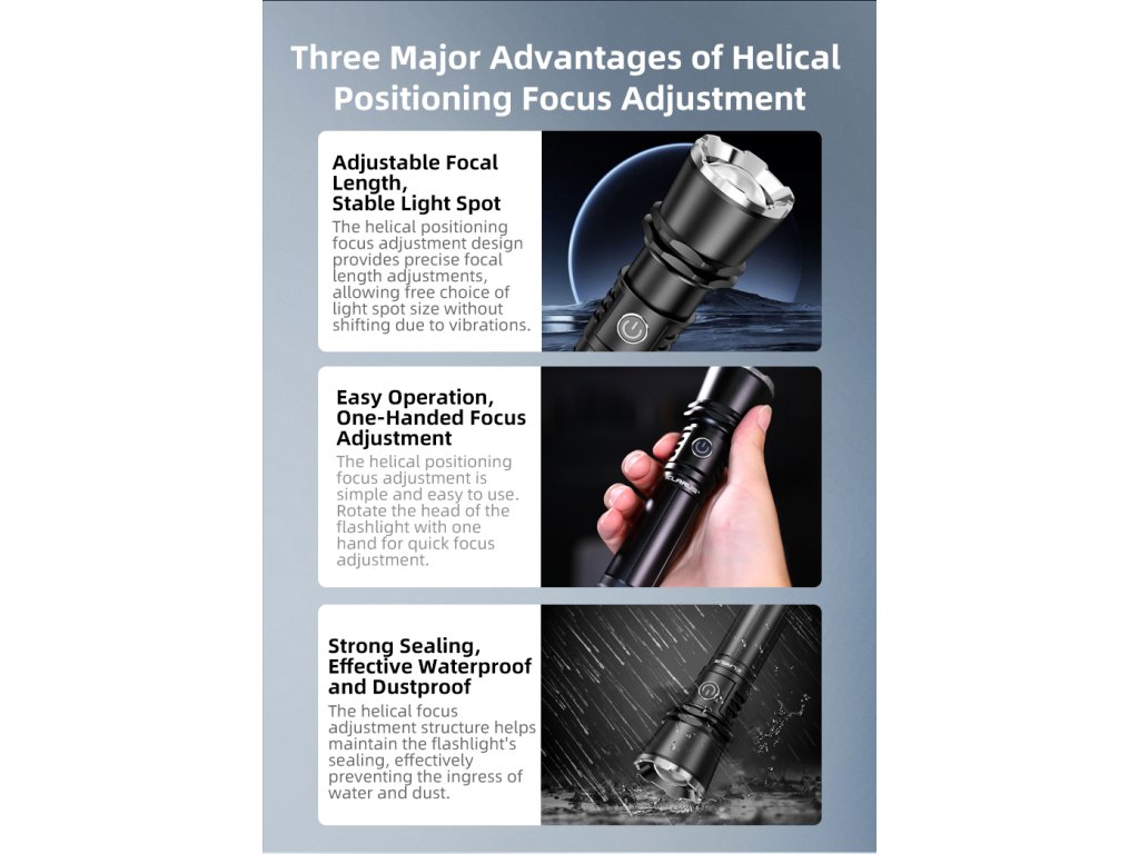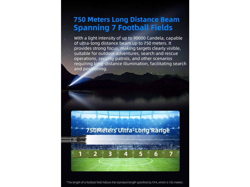- Spotlight: sústredený lúč 900 lm s dosahom až 750 m – hľadanie, navigácia, bezpečnosť.