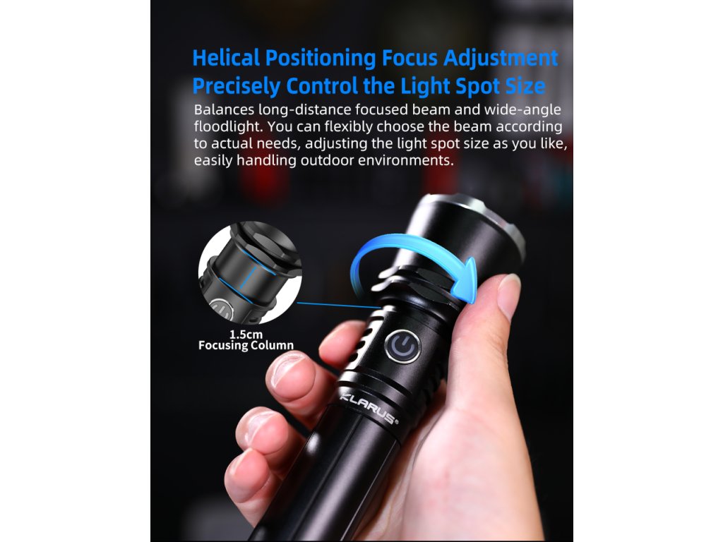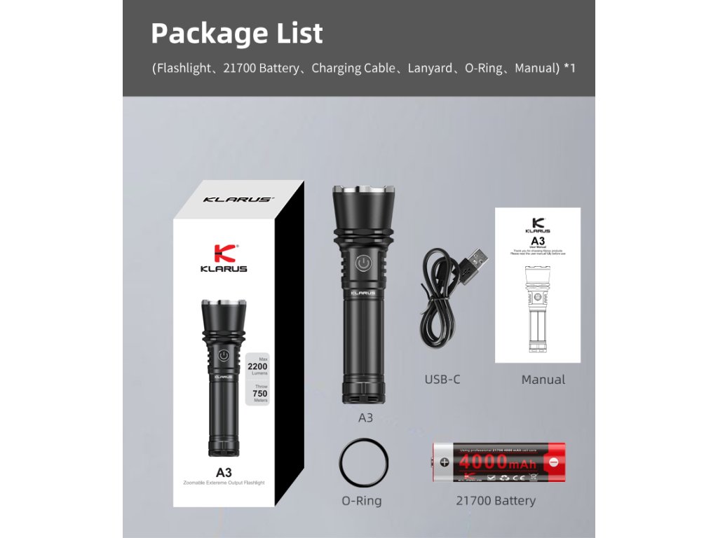 Klarus A3 – zoomovacia LED baterka 2200 lm, dosah až 750 m, Focus system, USB-C nabíjateľný + Li-ion aku. Klarus 21700 4000mAh 3,6V