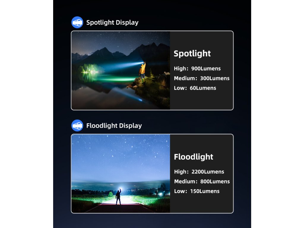 - Floodlight: až 2200 lm, ideálne na osvetlenie okolia a práce na blízko.