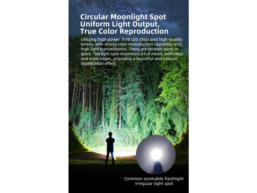 Flood je široký lúč na blízko až 2200 lm/100 m. Spot je úzky lúč na diaľku 900 lm s dosahom až 750 m. Prepína sa manuálnym zoomom otáčaním hlavy.
