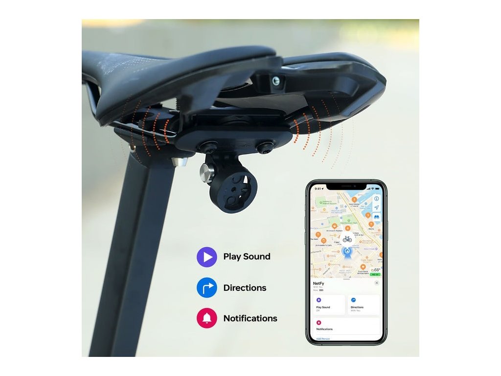 NetFy využíva crowdsourcingovú Apple Find My sieť, ktorá pozostáva z miliárd aktívnych Apple zariadení po celom svete. Váš tracker vysiela šifrovaný Bluetooth signál, ktorý zachytávajú okolité iPhone, iPad a Mac zariadenia – kompletne anonymne a bez zásahu do súkromia. Aktualizácie polohy dostávate každé 1-2 minúty v hustých mestských oblastiach. Ak je bicykel v blízkosti, môžete aktivovať zvukovú signalizáciu pomocou funkcie "Play Sound" a jednoducho ho nájsť v garáži, pivnici alebo na bicyklovom stojane medzi inými bicyklami.