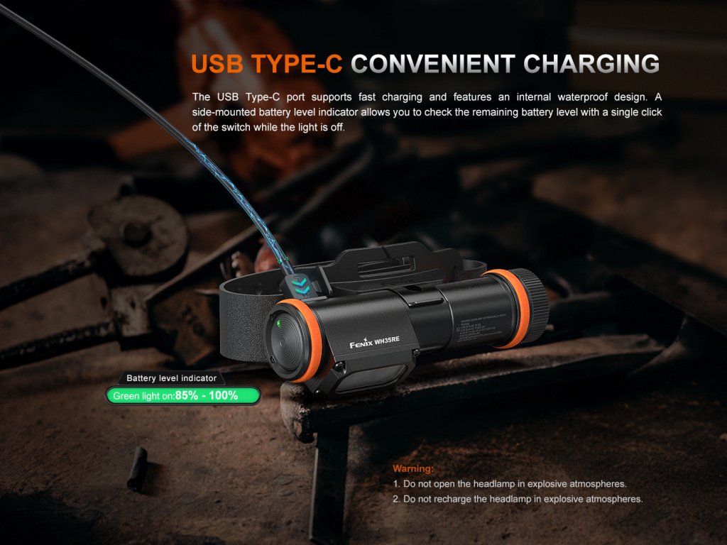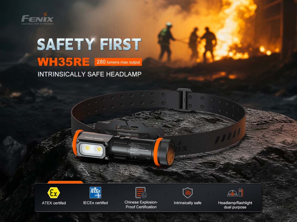Fenix WH35RE je bezpečná pracovná čelovka do výbušného prostredia, určená pre rôzne oblasti s rizikom výbuchu, okrem podzemných baní. Je vybavená certifikáciou ATEX/IECex. Ponúka maximálny výkon 280 lúmenov a napája ju jeden špeciálne upravený Li-ion akumulátor ARB-L21-3000Ex s kapacitou 3000 mAh (je súčasťou balenia), ktorý sa dobíja priamo v svietidle cez moderný USB-C konektor. Praktickosť čelovky zvyšuje možnosť vybrať svetlo z hlavového držiaka a používať ju aj ako vreckovú či pracovnú svietidlo. Navyše je čelovka vybavená oceľovou odnímateľnou sponou, takže ju ľahko uchytíte na vrecko či popruh. Jej veľký spínač umožňuje jednoduché a presné ovládanie – dokonca aj v rukaviciach.