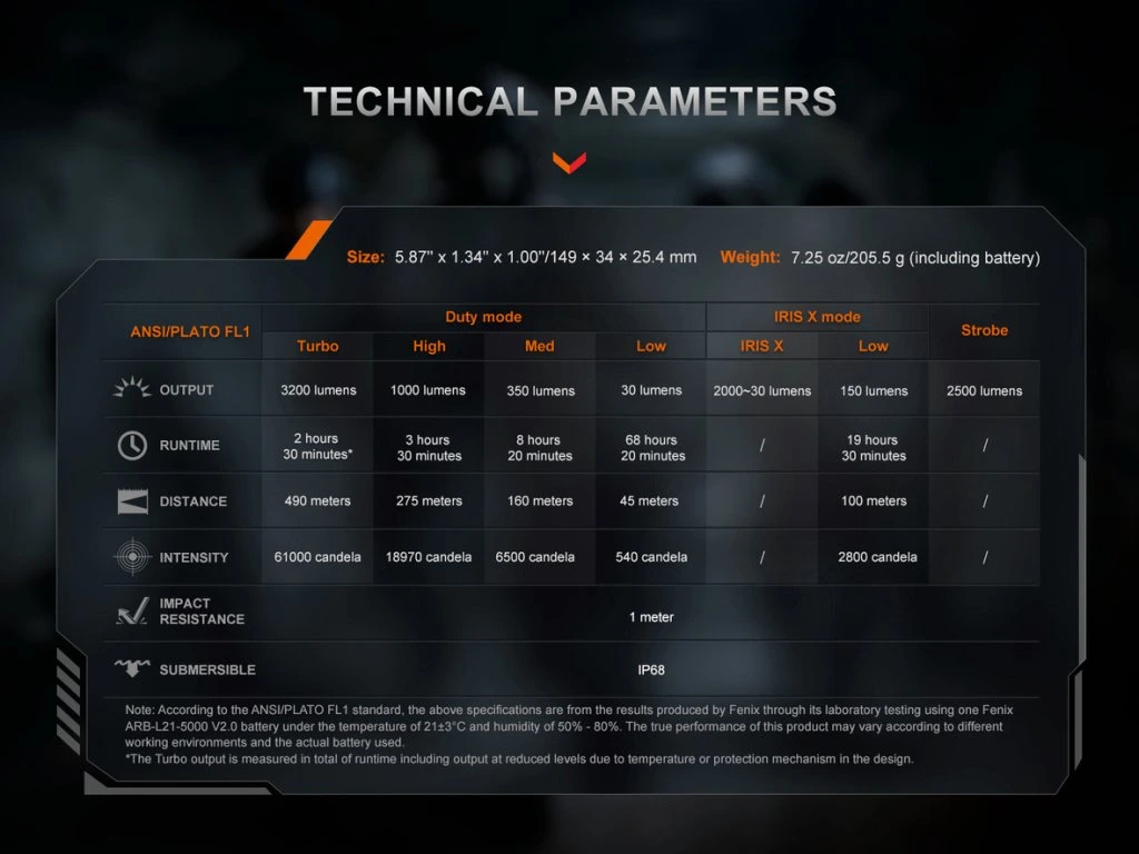 Všetky parametre svietidla (svetelný tok, doba prevádzky na batérie, vodotesnosť, dosvit a nárazuvzdornosť) sú zmerané v súlade s normou ANSI/NEMA FL 1-2009.