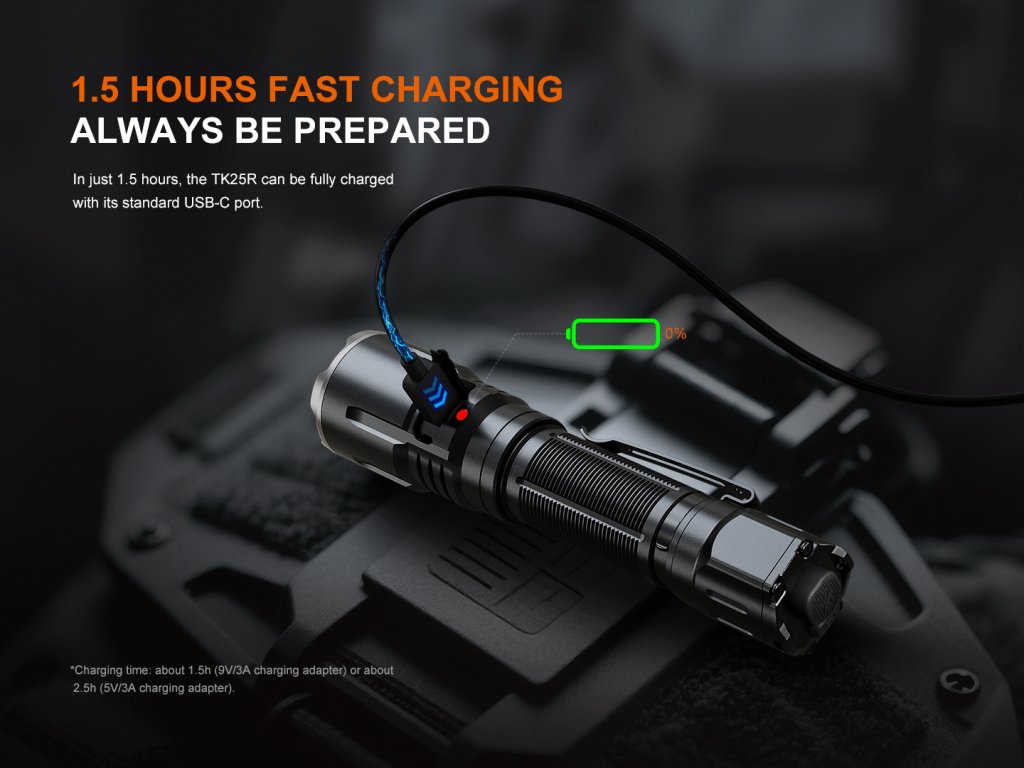 Fenix TK25R je špičkové taktické svietidlo, ktoré ponúka vysoký výkon a univerzálne využitie vďaka kombinácii hlavného a bočného reflektora. Hlavný reflektor s prémiovou LED Cree XHP50.3 poskytuje svetelný tok až 3600 lúmenov s dosvitom 350 metrov. Unikátnou vlastnosťou tohto modelu je integrované bočné svetlo, ktoré disponuje difúznym bielym, červeným a ultrafialovým svetlom (365 nm) s výkonom až 700 mW, ktoré umožní napríklad rýchlu kontrolu pravosti dokladov a bankoviek, vytvrdzovanie lepidiel či kontrolu úniku kvapalín. Ďalej je bočné svetlo vybavené funkciou červeno-modrého blikania, čo ocenia najmä ozbrojené zložky. Napájanie zaisťuje Li-ion akumulátor typu 21700 (Fenix ARB-L21-5000 V2.0) s kapacitou 5000 mAh, ktorý sa nabíja cez moderný USB-C konektor priamo na tele svietidla. Telo je vyrobené z odolnej hliníkovej zliatiny A6061-T6 s tvrdou anodizáciou a je plne vodotesné a prachotesné podľa štandardu IP68.