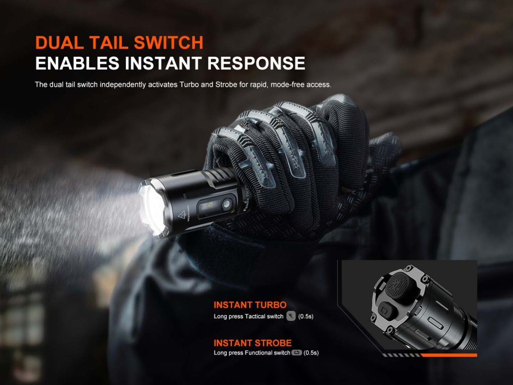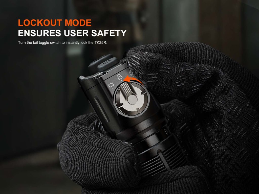 Fenix TK25R ponúka celkom päť režimov hlavného reflektora vrátane oslepujúceho stroboskopu a šesť režimov bočného svetla (vrátane červeného svietenia pre zachovanie nočného videnia). Na ovládanie slúži taktický duálny spínač v koncovke, ktorý umožňuje momentálne zapnutie, pohotové spustenie režimu turbo aj okamžitú aktiváciu stroboskopu. Táto ergonómia je ideálna pre krízové situácie, kedy je potrebné svetlo použiť rýchlo a bez hľadania tlačidiel.