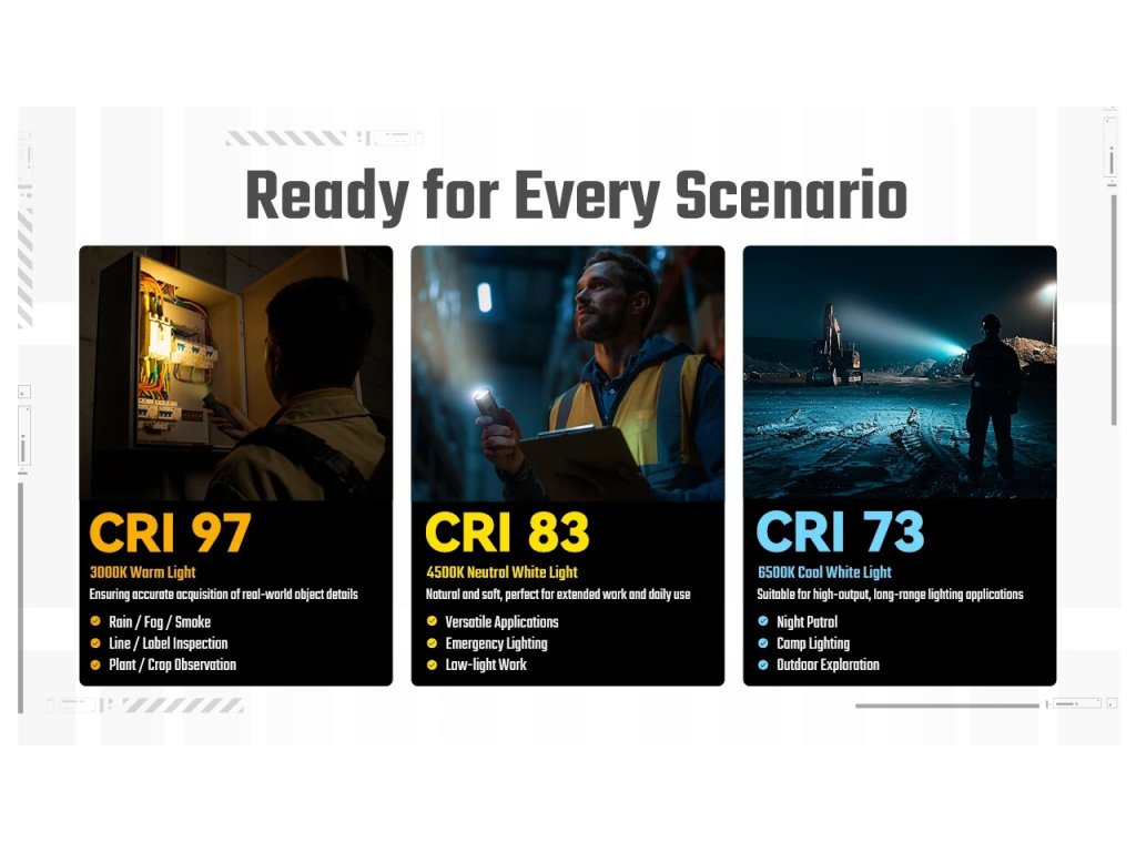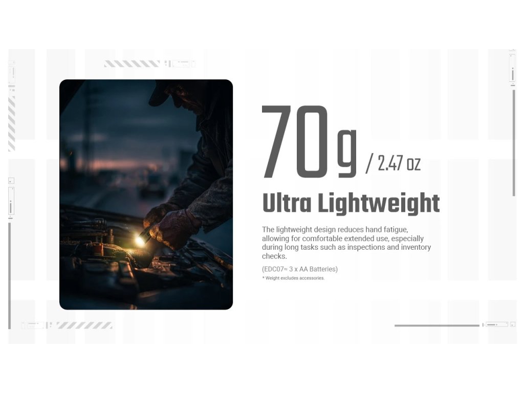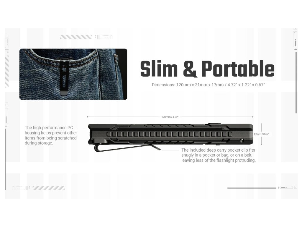 EDC nositeľ / mestský profesionál Baterka hrúbky 17 mm a hmotnosti 70 g sa zmestí do predného vrecka nohavíc bez viditeľného výčnelku. Prepnutie z 6 500K na teplú 3 000K s CRI 97 podržaním tlačidla M – ideálne keď treba presne posúdiť farbu materiálu, káblov alebo dokumentov v teréne.