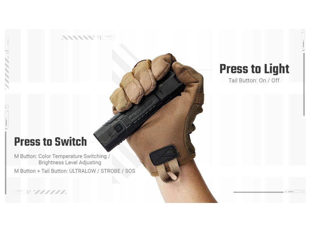Aktivácia Ultralow – keď je svietidlo vypnuté, stlač a drž tlačidlo M, potom úplne stlač tlačidlo na konci. Svietidlo sa zapne v režime Ultralow (1 lm).