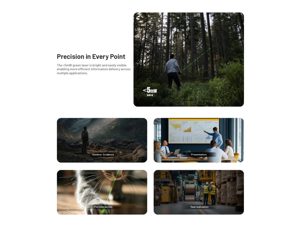 Zelený laser s vlnovou dĺžkou 510-530nm a výkonom <5mW je klasifikovaný ako Class 3R podľa IEC 60825-1. Práve zelená farba v tomto spektre je najbližšie k maximu citlivosti ľudského oka, čo znamená, že zelený laser je výrazne viditeľnejší než červený laser pri rovnakom výkone. Ideálne pre prezentácie, signalizáciu na veľké vzdialenosti, ukazovanie objektov v teréne či prácu v skladoch. Výdrž až 72 hodín v kontinuálnom režime.