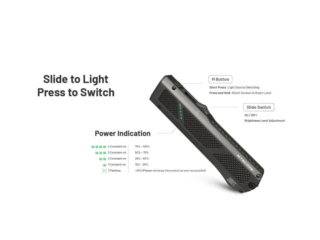 - ⚙️ Intuitívne slide switch ovládanie: Jedinečný posuvný prepínač kombinovaný s M tlačidlom umožňuje jednoručné ovládanie všetkých funkcií. Pamäť posledného režimu, poistka proti náhodnému zapnutiu, 4 úrovne jasu bieleho svetla + priamy prístup k laseru.