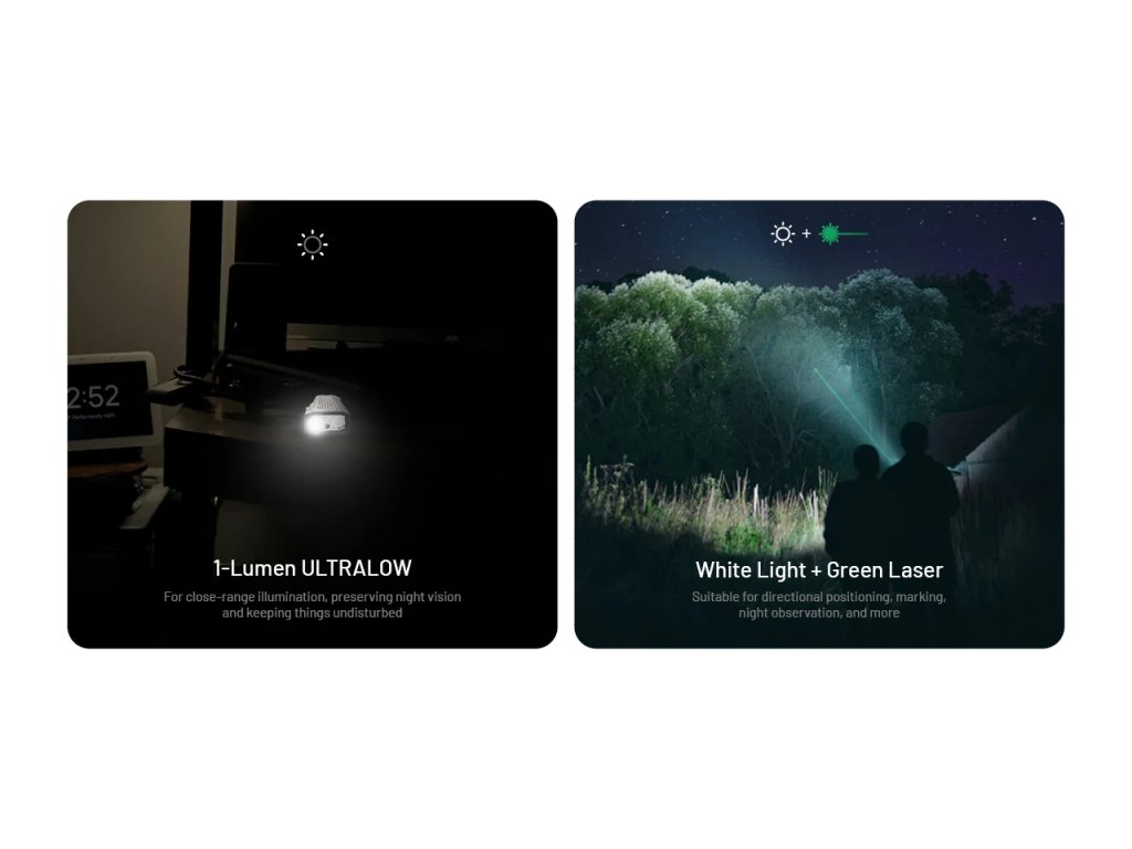Nočné aktivity a camping: Silný hotspot 230m dosahu na orientáciu v teréne, široké halo pre prácu v tábore. ULTRALOW režim 1 lúmen šetrí nočné videnie a poskytuje decentné svetlo na 260 hodín. Zelený laser pre signalizáciu na veľké vzdialenosti.