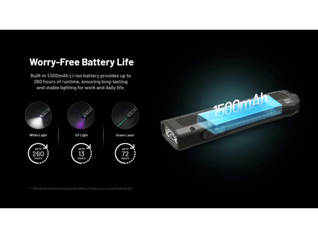 - ⚡ Trojitá funkcionalita 3-v-1: Biele LED svetlo NiteLab UHi 25 s výkonom 1500 lúmenov a dosahom 230 metrov, profesionálne UV svetlo 365nm s 3 úrovňami (220-1350mW), a zelený laser Class 3R <5mW pre precízne ukazovanie.