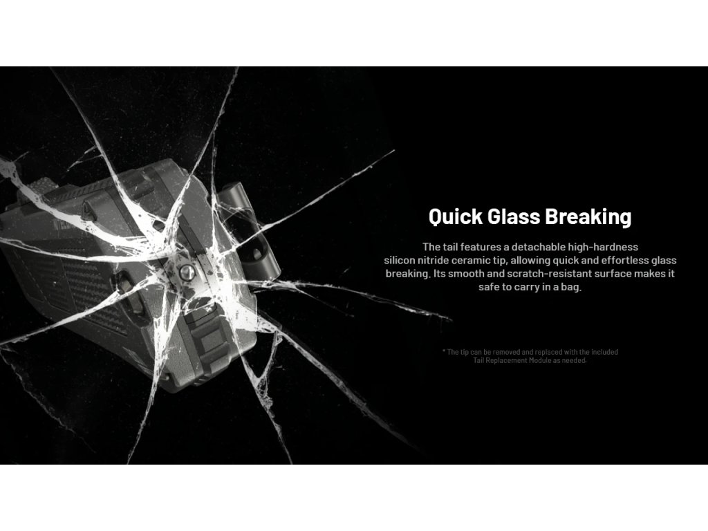 Na koncovke EDC17 sa nachádza odnímateľný Silicon Nitride keramický hrot pre núdzové rozbíjanie automobilového skla. V prípade autonehody pevne uchopte baterku a ostro uderte hrotom do rohu bočného okna (nie do stredu!) - sklo sa rozpadne na malé kúsky. Hrot koncentruje silu nárazu na malú plochu a ľahko prerazí tvrdené automobilové sklo. Po použití skontrolujte, či nie je hrot poškodený. Ak hrot nechcete nosiť (zavadzanie, bezpečnosť), môžete ho vymeniť za plochý náhradný modul, ktorý je súčasťou balenia. Stačí odskrutkovať fixačnú skrutku, vymeniť modul a opäť dobre utiahnuť.
