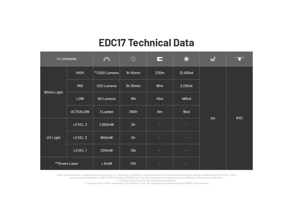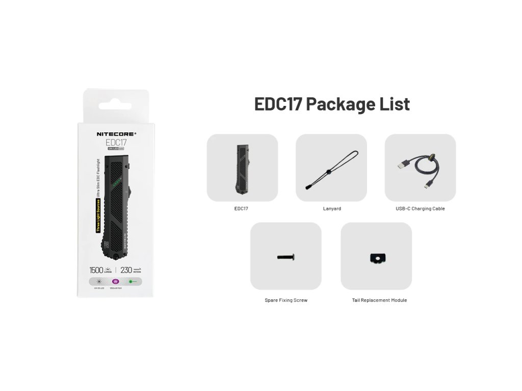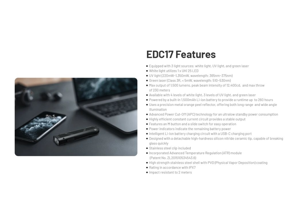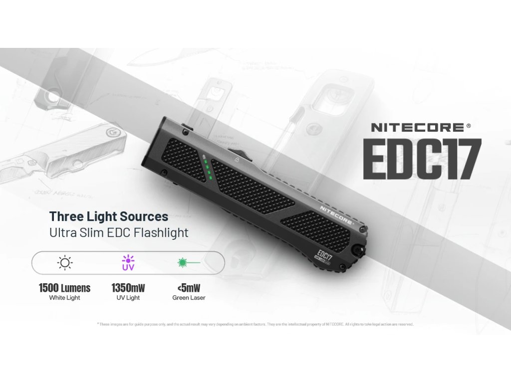 Nitecore EDC17 je ultra tenká multifunkčná LED baterka 3-v-1, ktorá kombinuje výkonné biele svetlo 1500 lúmenov, profesionálne UV svetlo 365nm a zelený laser <5mW v kompaktnom tele len 16mm vysokom. Určená pre každodenné nosenie (EDC), taktické použitie a profesionálne aplikácie.