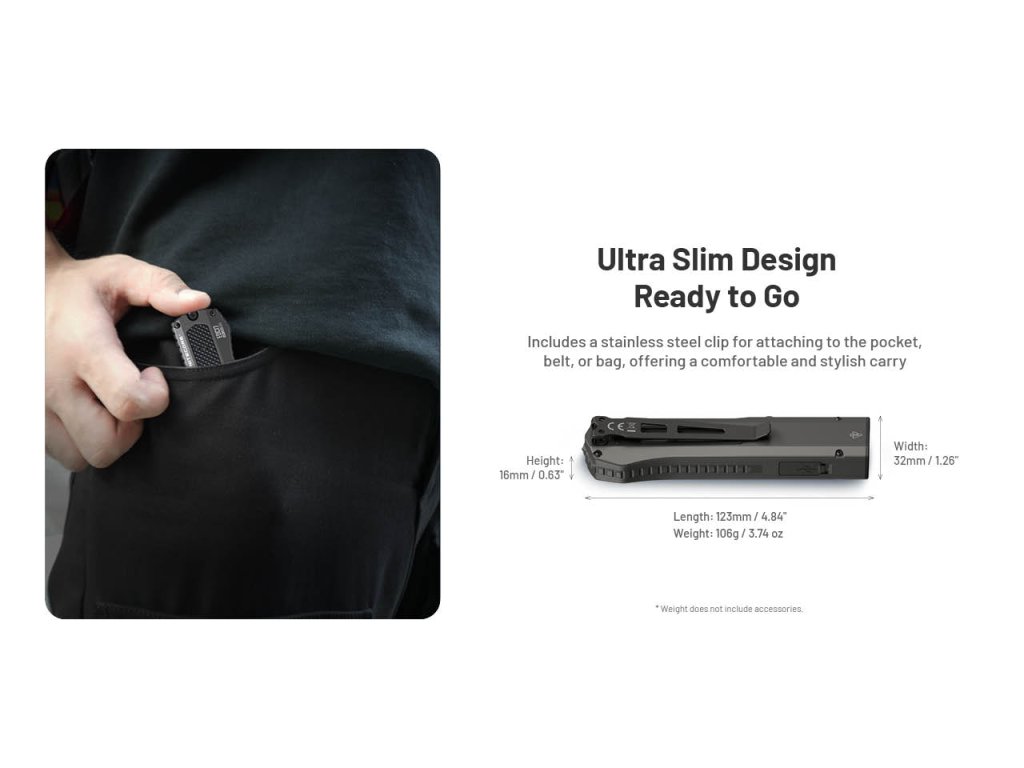 - 🎯 Ultra tenký EDC dizajn len 16mm: Kompaktné rozmery 123×32×16mm a hmotnosť iba 106 gramov umožňujú diskrétne nosenie vo vrecku. Predinštalovaný oceľový klip a plochý profil zaručujú pohodlné EDC nosenie bez zavadzania.