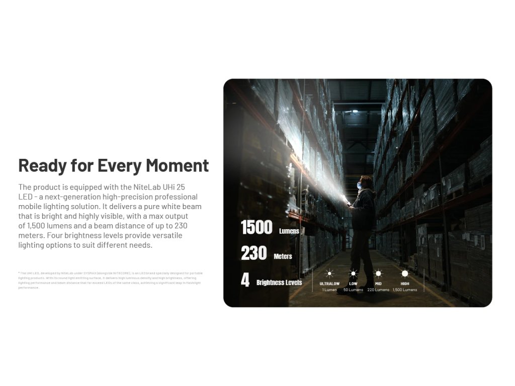 - NiteLab UHi 25 LED: Najnovší high-intensity LED emitter s účinnosťou a optimalizovaným svetelným výstupom pre EDC aplikácie. Dlhá životnosť až 50 000 hodín prevádzky.
