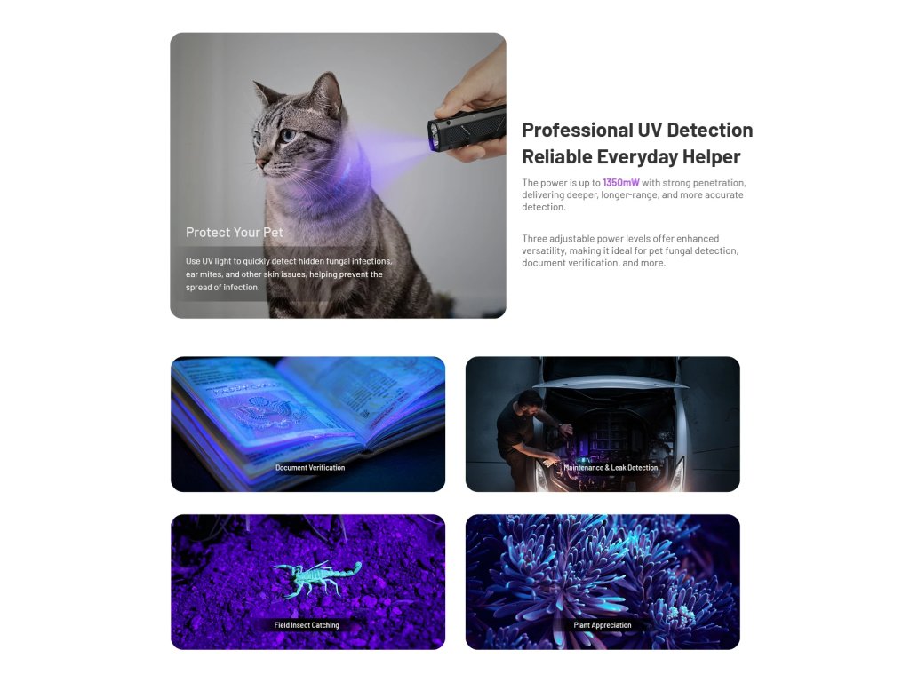 - Profesionálne UV svetlo 365nm s tromi úrovňami: Lacnejšie konkurenčné modely často ponúkajú len jednu úroveň UV svetla, prípadne používajú menej efektívne 395nm či 405nm spektrum. EDC17 poskytuje tri nastaviteľné úrovne výkonu (220/650/1350mW) v optimalizovanom 365nm spektre pre maximálnu fluorescenčnú reakciu a profesionálne výsledky.