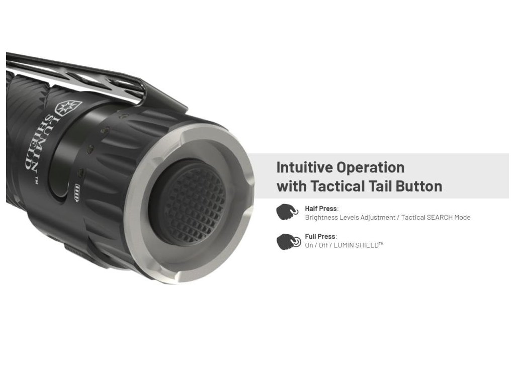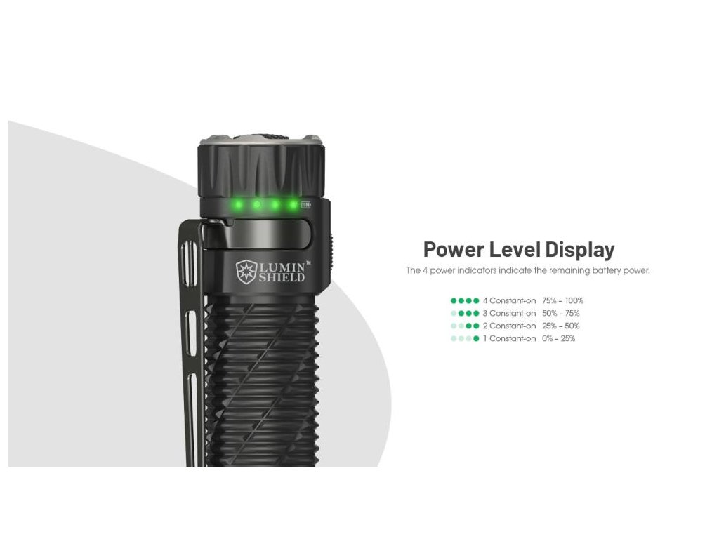 Čo je to LUMIN SHIELD technológia? LUMIN SHIELD koordinuje všetkých 9 jadier LED pre vytvorenie "svetelnej steny" s 5000 lúmenmi. Funguje podobne ako veľký osobný obranný štít a ponúka jedinečný zážitok zo sebaobrany.