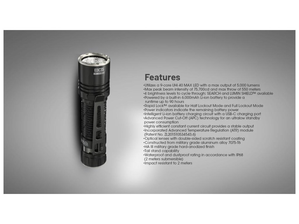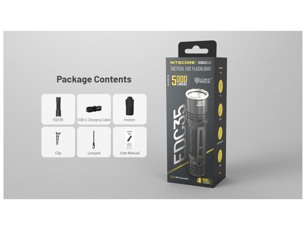 Predstavujeme Nitecore EDC35 - novú generáciu ultraľahkých taktických baterek, ktorá redefinuje štandardy EDC vybavenia. S revolučným UHi 40 MAX LED dosahuje neuveriteľný svetelný tok 5000 lúmenov a dosah až 550 metrov. Už žiadne kompromisy medzi výkonom a mobilitou! Táto technologická revolúcia prináša profesionálne USB-C nabíjanie, integrovanú 6000mAh batériu a hmotnosť len 171 gramov.