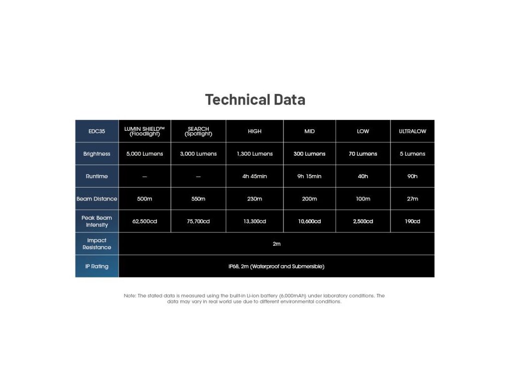 Aký je skutočný dosah svetla EDC35? 550 metrov je oficiálne meraný dosah v režime SEARCH s 3000 lúmenmi. Intenzita lúča dosahuje 75 700 cd, čo konkuruje stredne veľkým baterkám pokiaľ ide o osvetlenie na veľkú vzdialenosť.