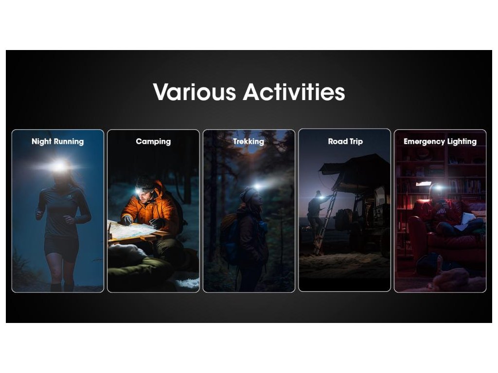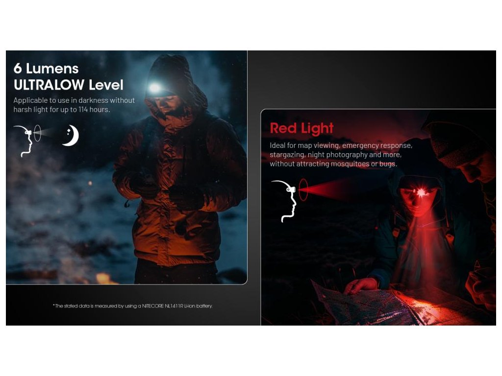 👁️ Červené svetlo pre zachovanie nočného videnia Dva režimy červeného svetla (HIGH/LOW) zachovávajú vašu prirodzenú adaptáciu na tmu a neoslňujú ostatných členov výpravy.