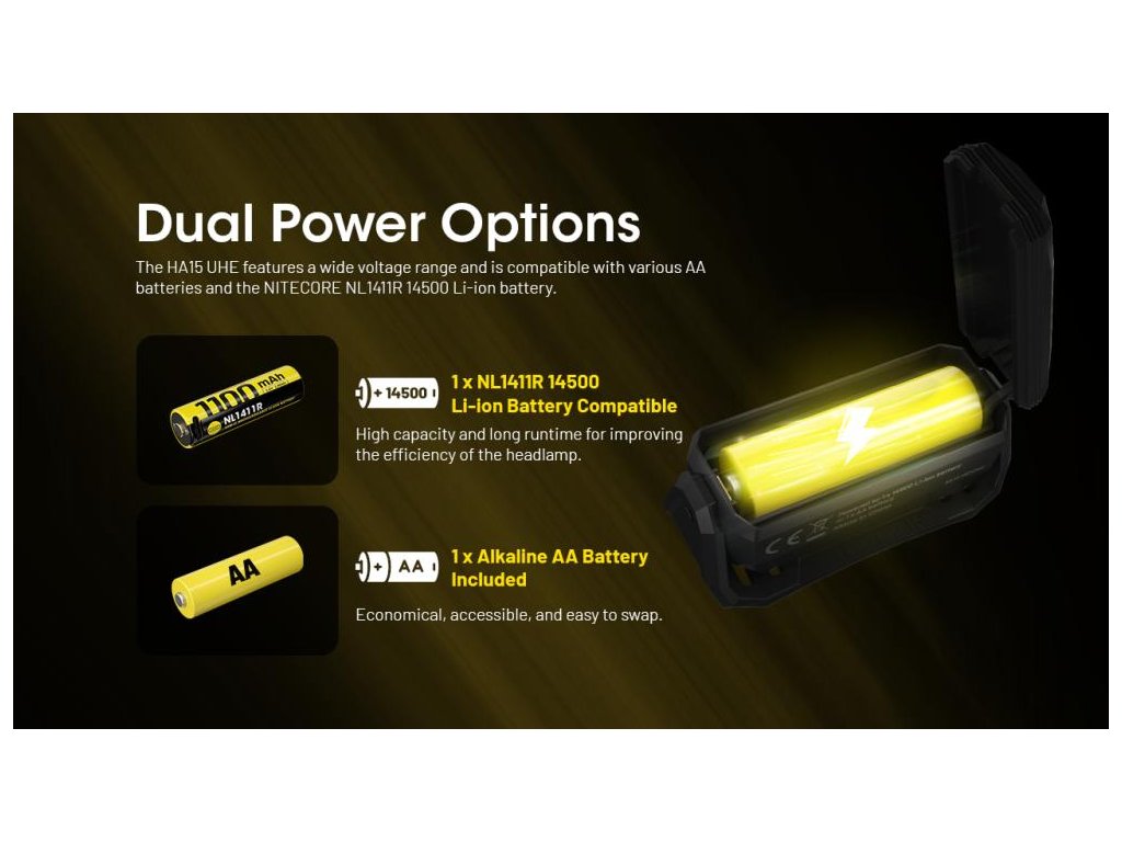 Môžem používať akúkoľvek AA batériu? Áno, HA15 UHE je kompatibilná s alkalickými, Ni-MH aj lithium AA batériami. V balení je zahrnutá Li-ion 14500 batéria NL1411R pre maximálny výkon 400 lúmenov. AA batérie môžete použiť ako zálohu.