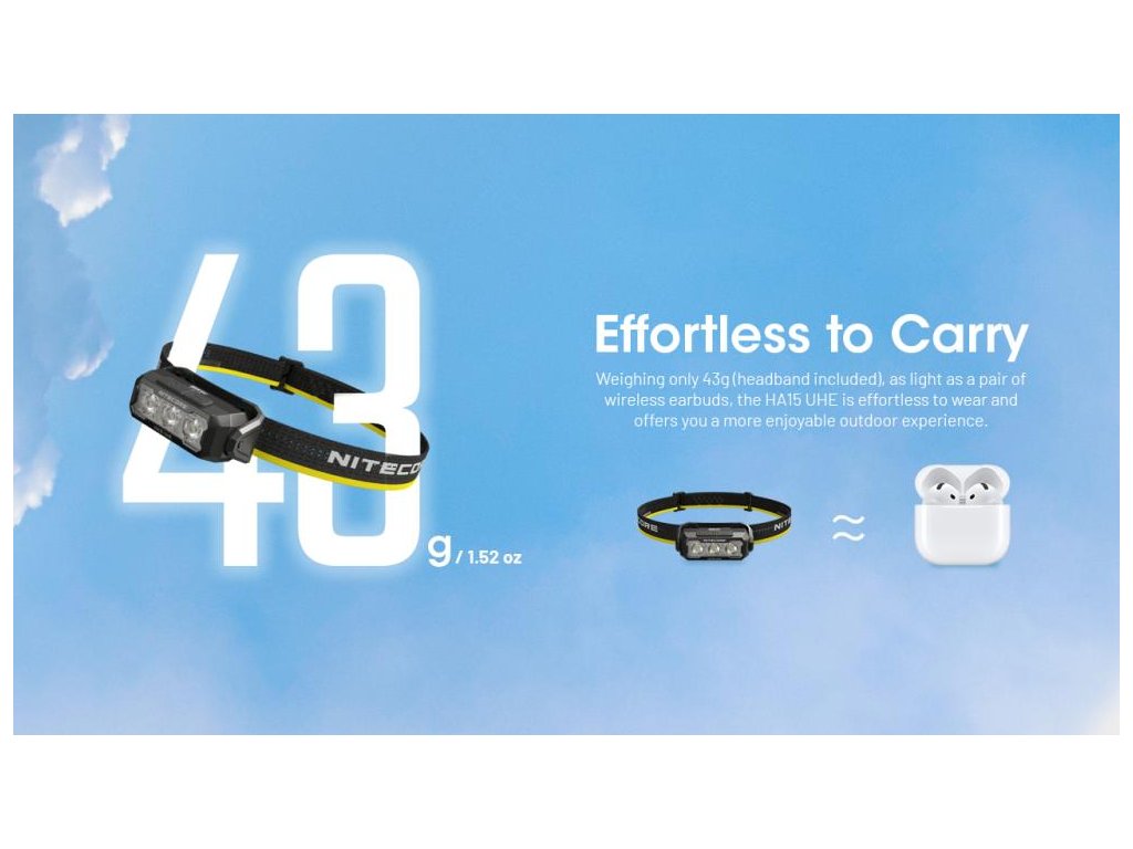 Predstavte si čelovku tak ľahkú, že zabudnete, že ju máte na hlave, ale pritom tak výkonnú, že vám osvetlí cestu do najvzdialenejších kútov prírody. NITECORE HA15 UHE v rozšírenom balení s Li-ion batériou je revolúciou v svete ultraľahkých čeloviek – s hmotnosťou len 43 gramov (menej ako bežné bezdrôtové slúchadlá!) ponúka 400 lúmenový výkon a 80-metrový dosvit. Táto technologická perla je navrhnutá pre všetkých, ktorí odmietajú kompromisy medzi hmotnosťou a výkonom.
