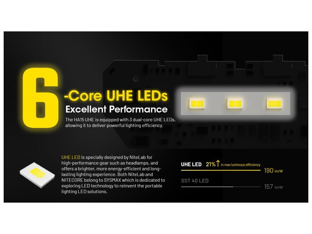 Srdcom HA15 UHE je 6x UHE (Ultra High Efficiency) LED technológia vyvinutá v laboratóriách NiteLab. Tieto revolučné LED čipy dosahujú o 21% vyššiu svetelnú účinnosť oproti štandardným LED, čo znamená viac svetla pri nižšej spotrebe energie. TrueVision Optical Matrix systém s 94% transmisiou svetla zabezpečuje rovnomerné rozptýlenie svetla bez tmavých škvŕn. Výsledkom je perfektná kombinácia intenzívneho svetla a ultra-dlhej výdrže v najkompaktnejšom možnom balení.
