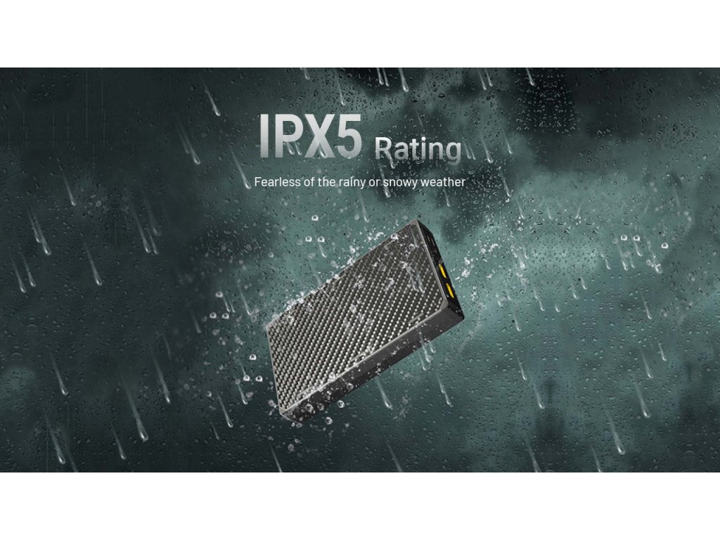 IPX5 certifikácia zaručuje odolnosť proti prudkému dažďu z každého uhla a vlhkosti. Powerbanka prežije ponorenie vodných striekajúcich tryskách zo všetkých strán. Odporúčame však chrániť USB-C porty počas nabíjania pred priamym kontaktom s vodou pomocou dodávaných gumových krytov.