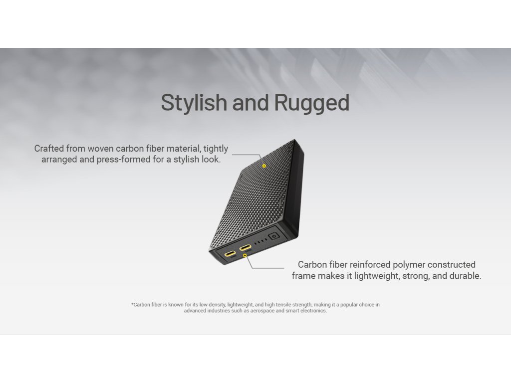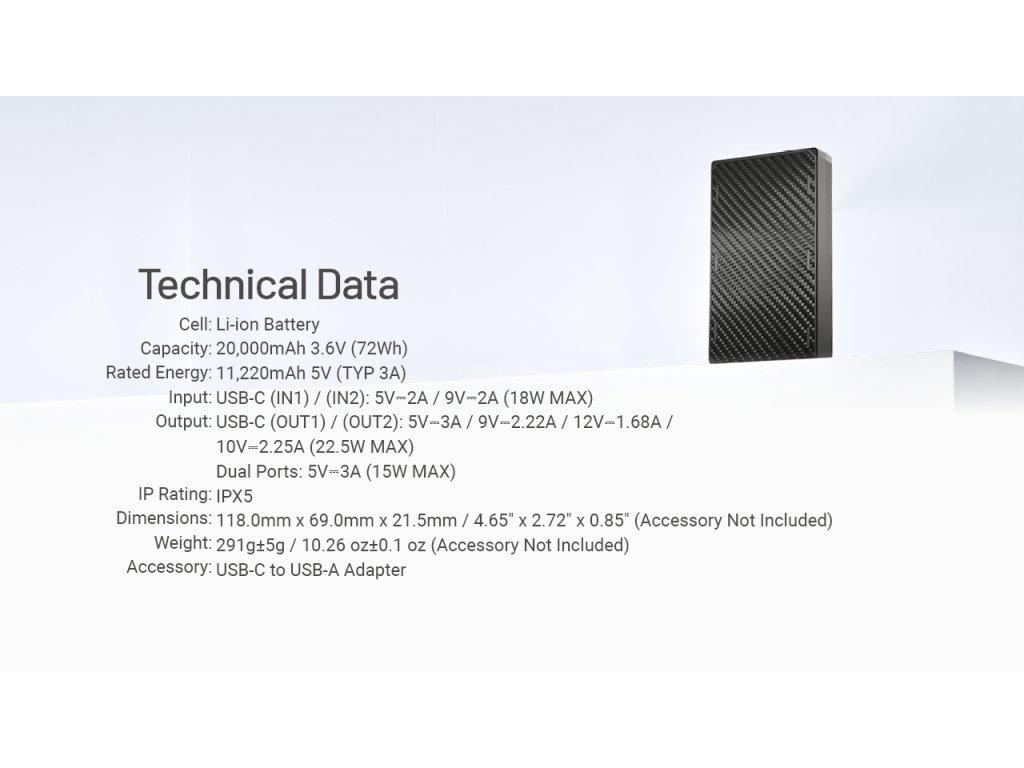 Áno, s hmotnosťou len 291 gramov a energetickou hustotou 247mWh/g patrí medzi absolútne najľahšie 20000mAh powerbanky na trhu. Tkanina z karbónových vlákien umožňuje až 35% úsporu hmotnosti oproti štandardným modelom - to znamená 160 gramov menej váhy v každom batohu.