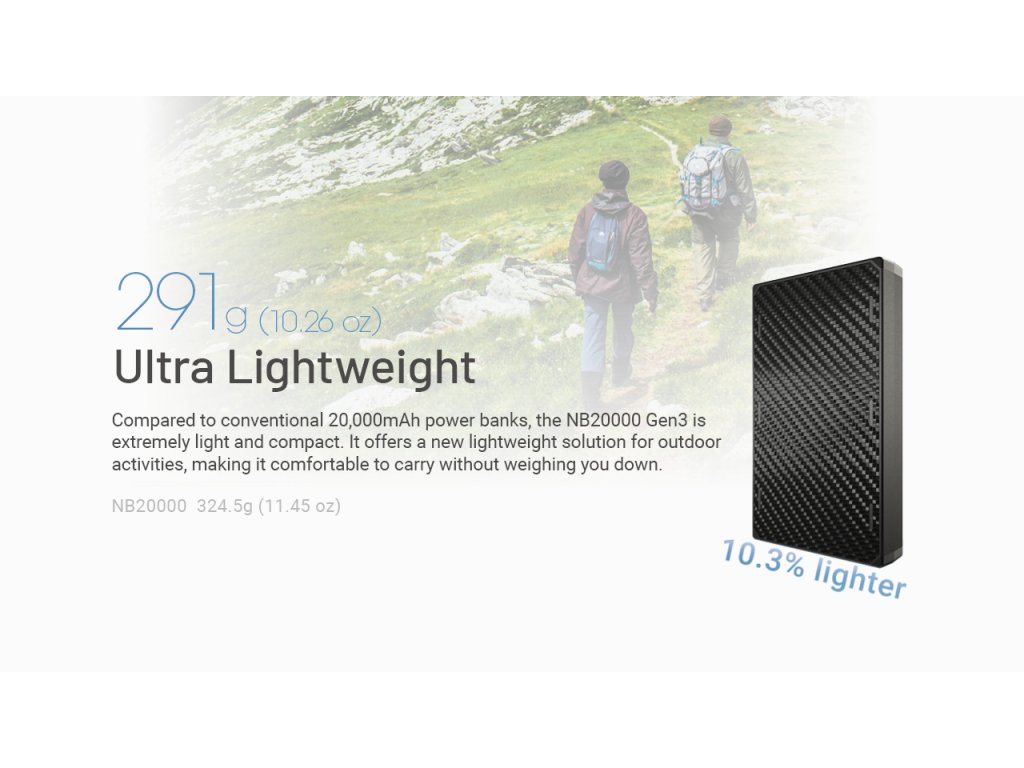 Poznáte ten pocit po celodennej túre, keď zložíte ťažký batoh a hovoríte si "predsa musí existovať niečo ľahšie"? NB20000 Gen3 s hmotnosťou 291g je presne to, čo hľadáte. Pri cestovaní naľahko s batohom pod 7 kíl rozhoduje každý gram. Štandardné powerbanky vážia 450g+, čo je ako extra pár turistických ponožiek navyše.