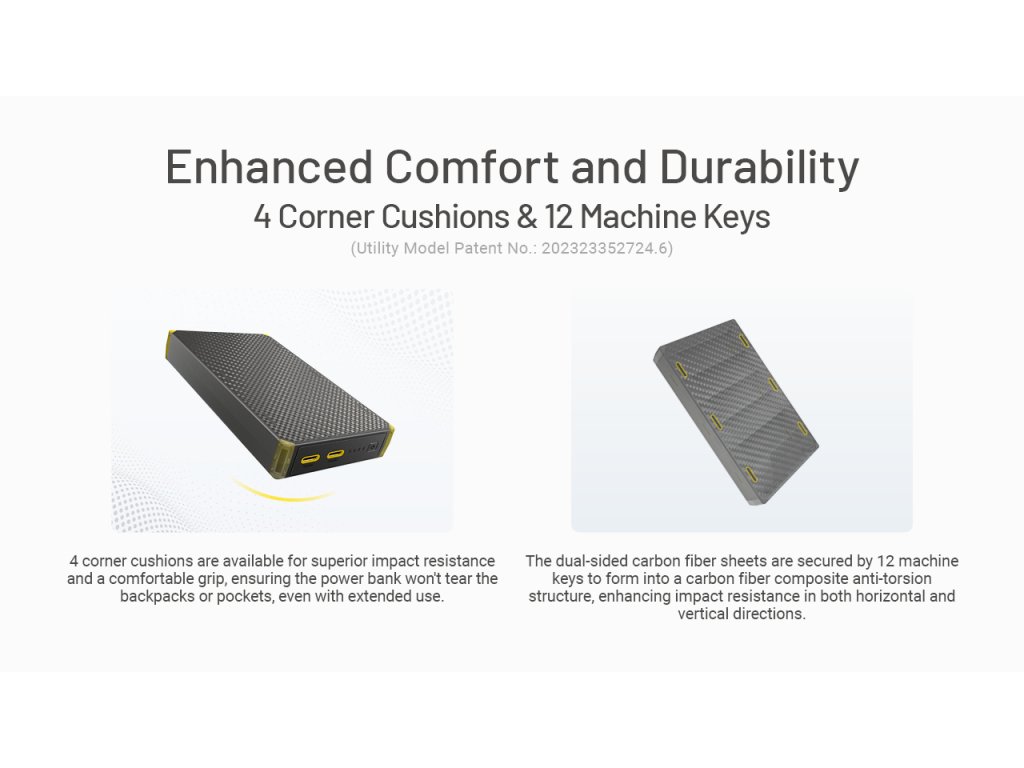 V horách a na trekkingoch sa zariadenia dostávajú do extrémnych situácií. Bežné plastové powerbanky sa rozpadnú pri prvom páde z batohu. NB20000 Gen3 používa pokročilú tkaninu z karbónových vlákien s patentovaným 12-bodovým systémom machine keys, ktorý vytvára anti-torznú štruktúru odolnú proti krúteniu a ohýbaniu.