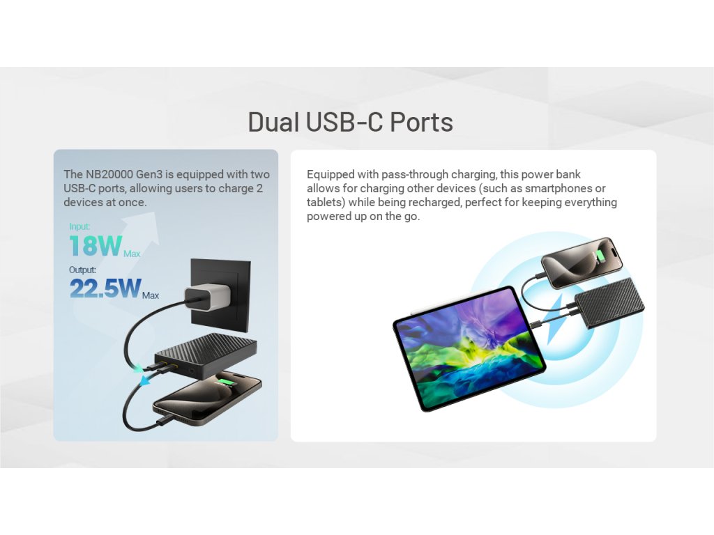 Pass-through charging umožňuje nabíjať NB20000 Gen3 a súčasne napájať vaše zariadenia - ideálne pre 24/7 provoz. Keď je jeden USB-C port pripojený k 18W nabíjačke, druhý port dokáže dodávať až 15W výkonu. Perfektné pre dlhé pracovné dni alebo viacdenné expedície s prístupom k elektrine.
