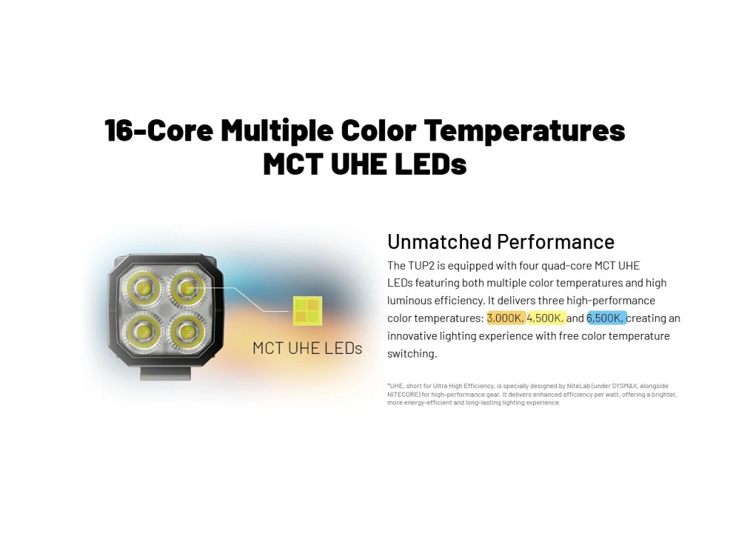 - MCT UHE LED (Ultra High Efficiency): Štyri quad-core LED diódy s ultra-vysokou účinnosťou - 1200 lúmenov pri zachovaní nízkej spotreby a kompaktných rozmerov. Patent CN202323108231.8