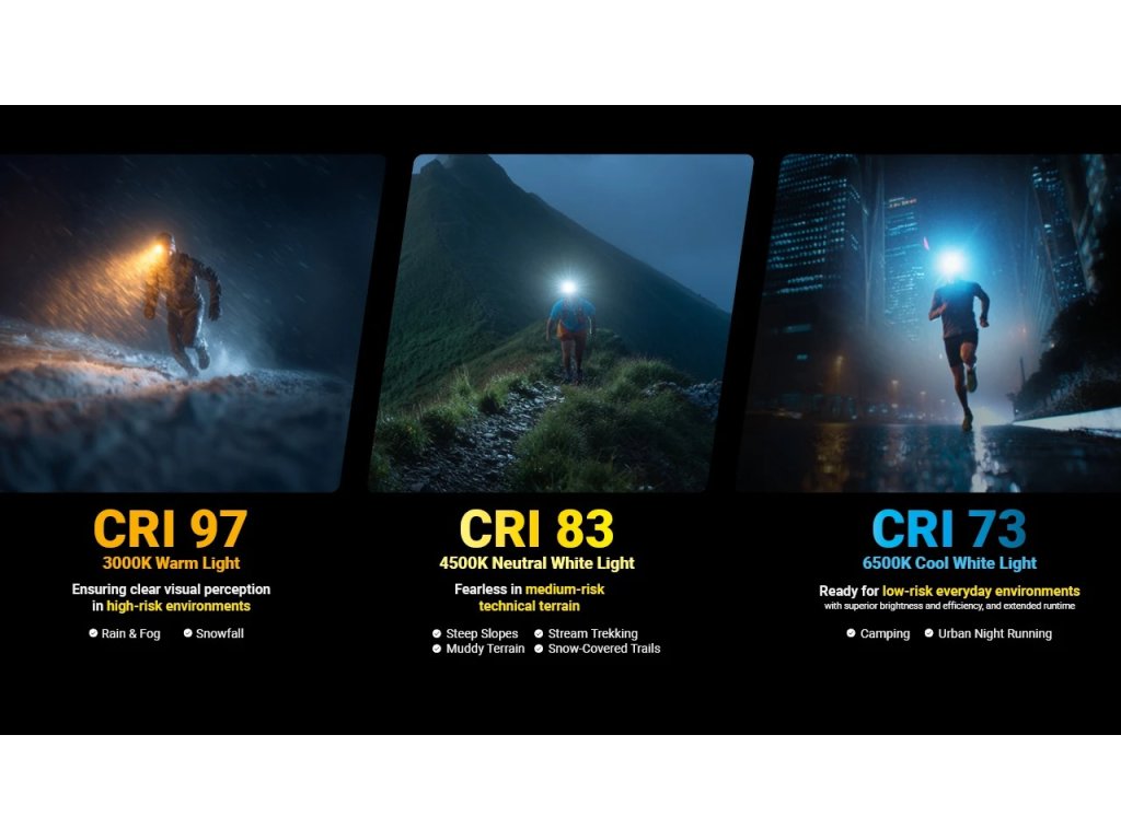 🎨 Tri teploty svetla s variabilným CRI: Čip Nitelabs MCT UHE umožňuje prepínať medzi studenou (6500 K, CRI 73), neutrálnou (4500 K, CRI 83) a teplou (3000 K, CRI 97) bielou – pre každú aktivitu ideálne svetlo. Teplá biela s CRI 97 poskytuje prirodzené podanie farieb pri mechanických prácach, fotografovaní a orientácii v náročnom teréne, zatiaľ čo studená biela s vyšším výkonom je ideálna pre rýchly beh v tme.
