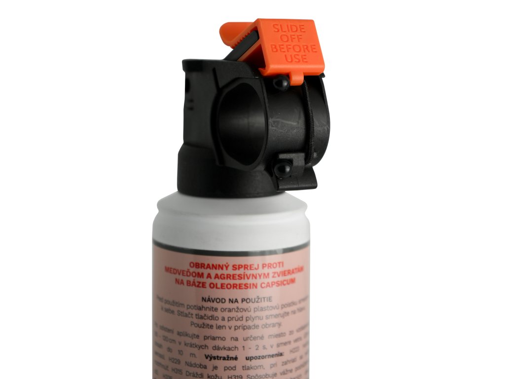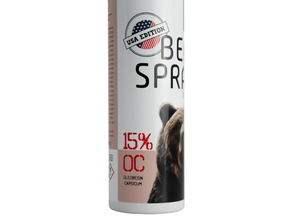 Obranný sprej proti medveďom s objemom 150 ml tých najkvalitnejších a najspoľahlivejších látok na našom trhu, ktorý bol inšpirovaný USA trhom. Účinná látka pozostáva z extrémne vysokého obsahu OC (Oleoresin Capsicum) - 15% a látky MC (Major Capsaicinoids) - 2%. Je pripravený na použitie v medziach nutnej obrany alebo krajnej núdze pri útoku medveďa, šelmy a útočiacej zveri, psom a pod. Jeho účinok sa dostavuje ihneď, a to okamžitou paralýzou vedomia. Sprej je reálne vyskúšaný a testovaný v praxi. Tlak v nádobe zaisťuje rýchlosť látky až 114 km/h, vďaka čomu je možné jeho použitie aj v prípade protivetra.