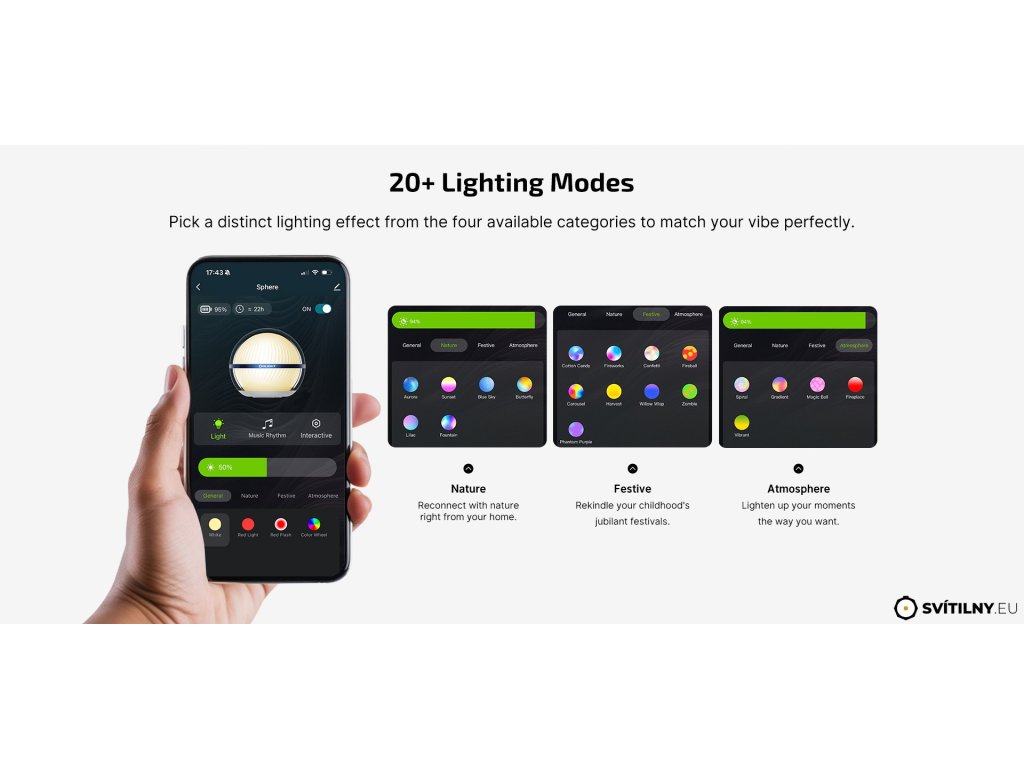 - Vyberte scénu – Light (20+ scén), Music Rhythm (synchronizácia so zvukom), Interactive (Bash-A-Mole, Countdown, skupinové ovládanie až 100 ks).