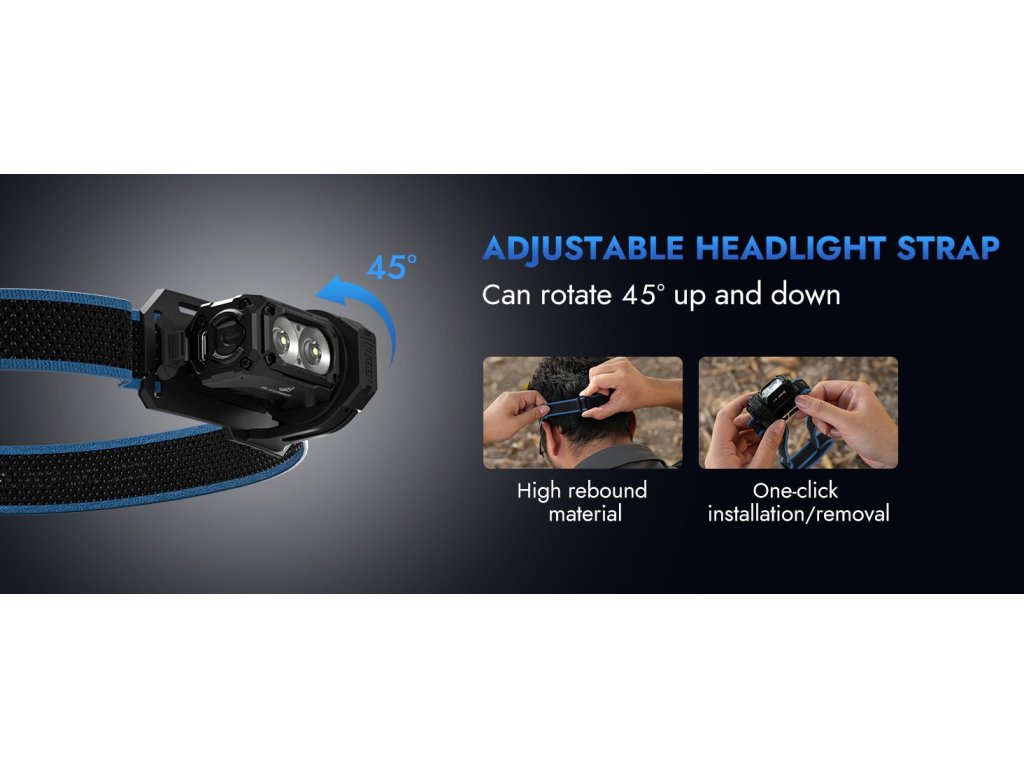 Wuben P1 Headband (čelenka) - Nastaviteľná elastická čelenka s kovovým upínacím systémom a mäkkou gumovou vložkou pre maximálny komfort. Držiak pevne drží baterku aj pri behu a umožňuje vyklonenie nahor/dolu približne o 45°. S týmto príslušenstvom sa E7 transformuje z kompaktnej EDC baterky na plnohodnotnú čelovku s hands-free použitím. Nastaviteľná dĺžka vyhovuje obvodu hlavy 52-65 cm.