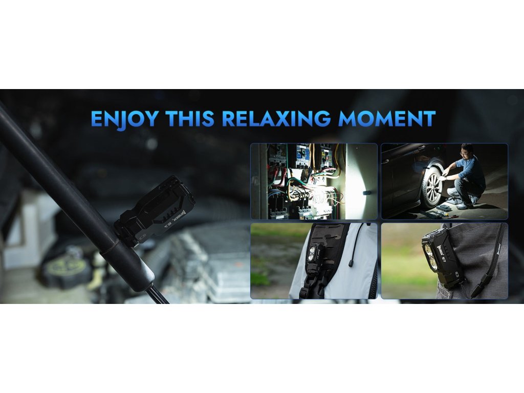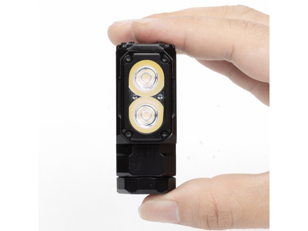 EDC (Every Day Carry): Kompaktné rozmery (60,6 mm dĺžka, 80 g hmotnosť) a odnímateľný klip umožňujú pohodlné nosenie v tašči alebo na opasku. Magnet umožňuje pripevnenie na kovové povrchy bez držania v ruke. Right-angle dizajn je praktickejší než klasické valcové baterky - môžete ju postaviť, priclipnúť alebo primagnetovať.