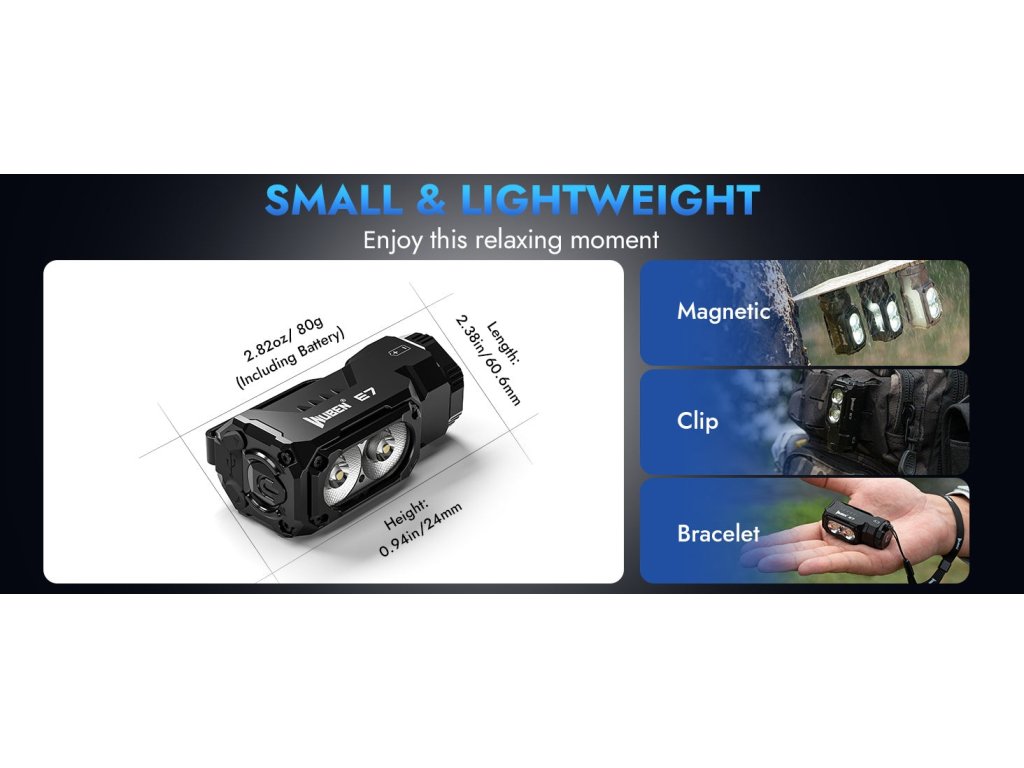 - Multifunkčné použitie 3-v-1: Konkurenčné modely sú buď len baterky alebo len čelovky. E7 je všetko naraz - EDC baterka s klipom + hands-free svetlo s magnetom + čelovka (s príslušenstvom). Jedno svietidlo, nekonečné možnosti!