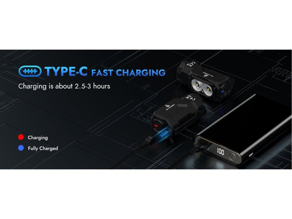 Otvorte gumový kryt USB-C portu na boku baterky. Pripojte USB-C kábel k baterke a k USB adaptéru alebo powerbanke (minimálne 5V/1A). Červená LED pri tlačidle signalizuje nabíjanie, zelená LED znamená takmer plne nabitú batériu (nad 90%). Nabíjanie priloženej 1100mAh batérie trvá približne 1,5 hodiny (na 90% už za 75 minút). Po nabití zatvorte gumový kryt (nie je to kritické kvôli internej vodotesnosti, ale predlžuje životnosť portu). Pre kontrolu stavu batérie z vypnutého stavu jednorázovo stlačte tlačidlo - modrá svieti (90%+), modrá bliká (40-90%), červená svieti (15-40%), červená bliká (pod 15%). Poznámka: V balení môže byť buď USB-A na USB-C alebo USB-C na USB-C kábel (náhodne podľa dostupnosti).