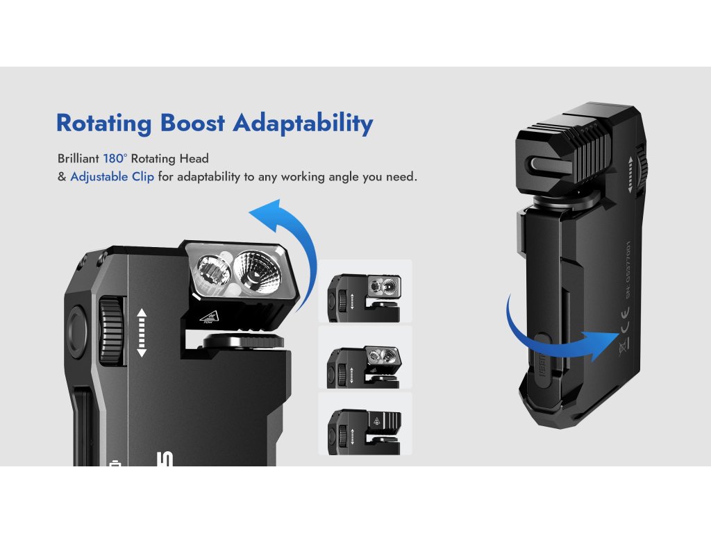 Pre otočenie hlavy jednoducho uchopte hlavu baterky (časť s LED) a otáčajte v rozsahu 180° (od úplne kolmo hore až úplne kolmo dole). Mechanizmus má dostatočný odpor, aby hlava zostala v nastavenej pozícii aj pri pohybe alebo vibráciách. Magnet na spodnej časti baterky automaticky drží na kovových povrchoch - priložte a pustite. Pre použitie s klipom: Klip je nastaviteľný - dá sa otočiť do 4 pozícií. Stlačte klip smerom k telu baterky a otočte do želanej pozície. Klip drží na okraji vrecka, opasku, šiltovke, popruhu batohu alebo okraji kapsy. Kombinácia klip + otočná hlava = improvizovaná čelovka alebo hands-free osvetlenie v akejkoľvek pozícii.
