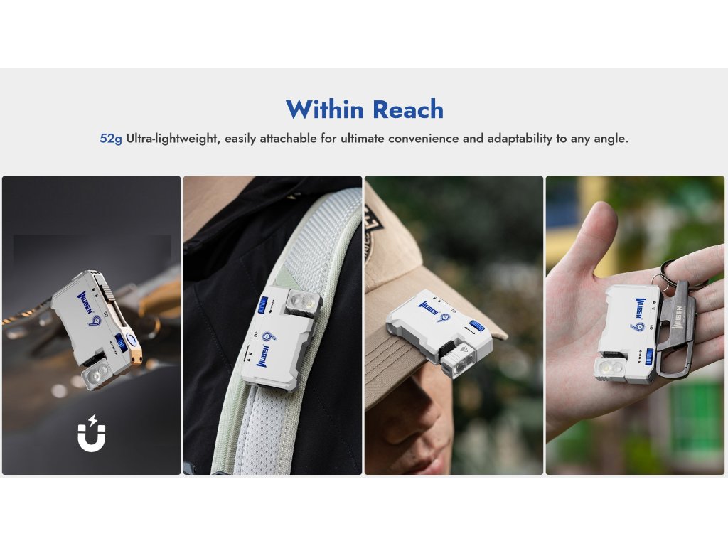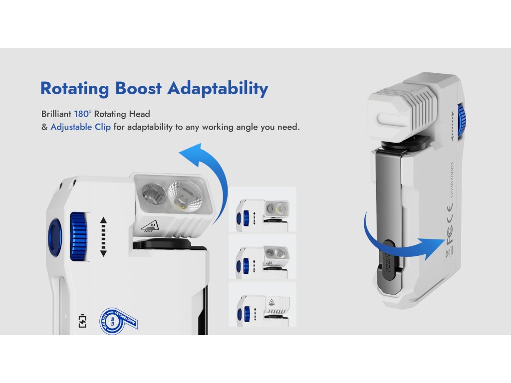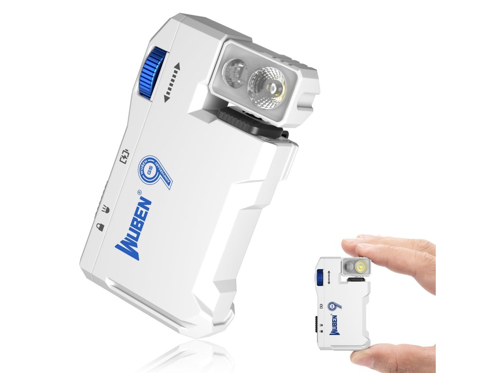 Pre otočenie hlavy jednoducho uchopte hlavu baterky (časť s LED) a otáčajte v rozsahu 180° (od úplne kolmo hore až úplne kolmo dole). Mechanizmus má dostatočný odpor, aby hlava zostala v nastavenej pozícii aj pri pohybe alebo vibráciách. Magnet na spodnej časti baterky automaticky drží na kovových povrchoch - priložte a pustite. Pre použitie s klipom: Klip je nastaviteľný - dá sa otočiť do 4 pozícií. Stlačte klip smerom k telu baterky a otočte do želanej pozície. Klip drží na okraji vrecka, opasku, šiltovke, popruhu batohu alebo okraji kapsy. Kombinácia klip + otočná hlava = improvizovaná čelovka alebo hands-free osvetlenie v akejkoľvek pozícii.