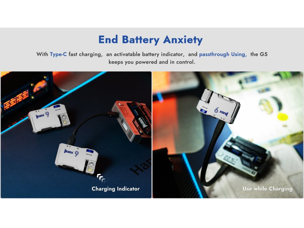 Plné nabitie z 0 na 100% trvá 1,5 hodiny cez USB-C (5V/1A). Áno, G5 ECL má passthrough funkciu - môžete ju používať počas nabíjania, čo je užitočné keď pracujete v dielni alebo kancelárii s prístupom k USB portu. Integrovaný akumulátor 450mAh znamená, že nemusíte nosiť náhradné batérie. Indikátor stavu batérie vás upozorní keď je čas nabiť (pri 15% kapacity). Bonus: USB-C = univerzálny štandard = nabíjate z toho istého kábla ako telefón alebo laptop.