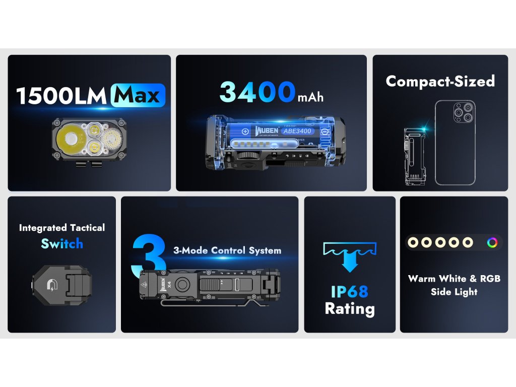 Rýchla odpoveď: Wuben X4 Black je ultrakomaktná multifunkčná EDC baterka s duálnym svetelným systémom (hlavné 1500 lm + RGB bočné) navrhnutá pre denné nosenie, outdoor, camping, prácu bez použitia rúk a núdzové situácie.